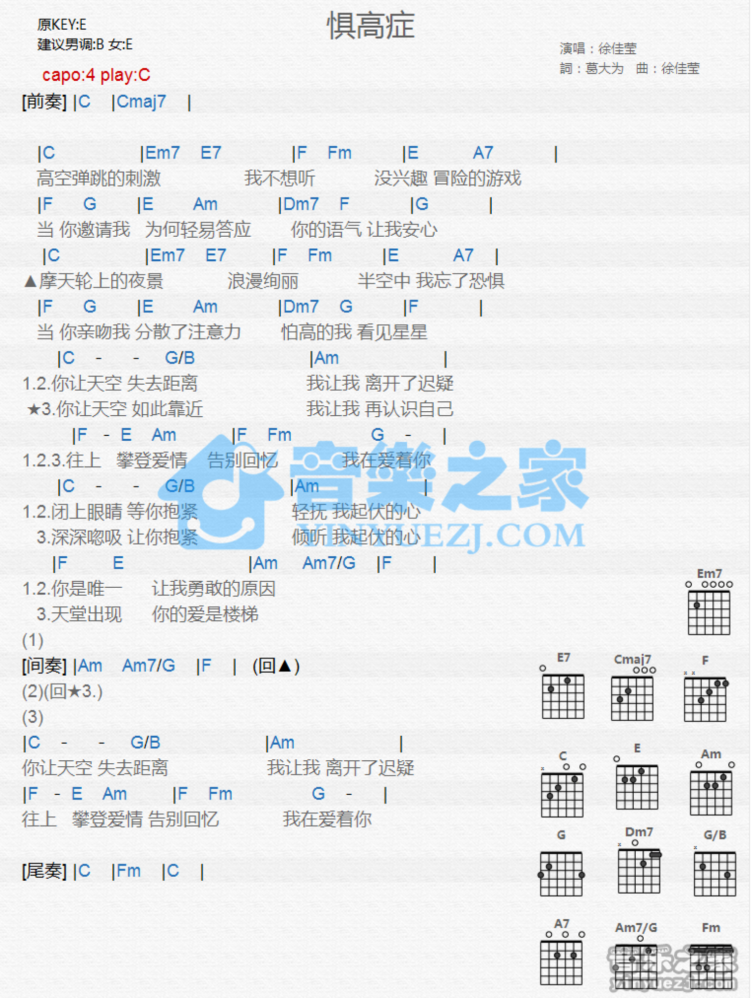 曲谱介绍: C调版徐佳莹《惧高症》吉他和弦弹唱谱