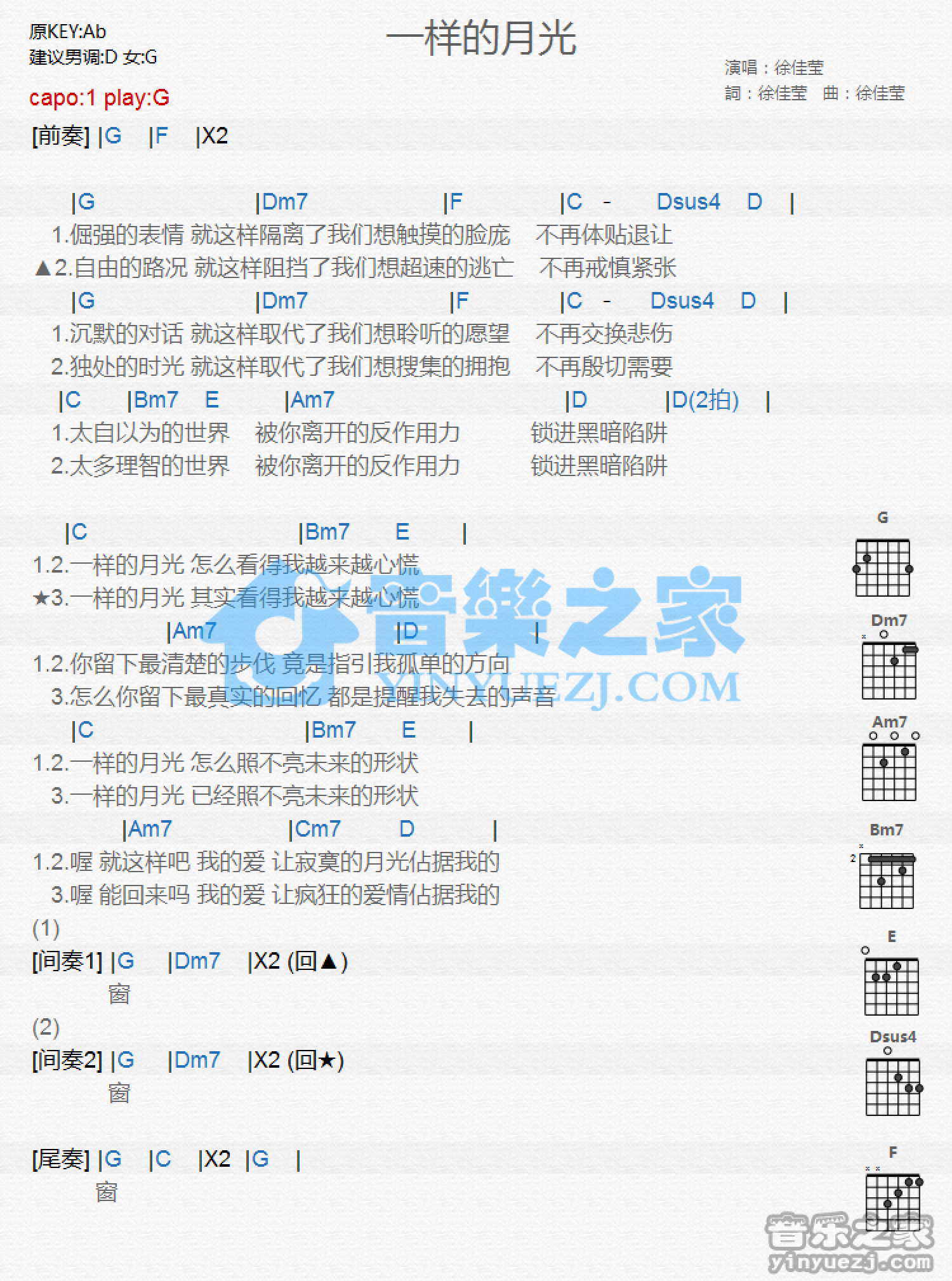 曲谱介绍: G调版 徐佳莹《一样的月光》吉他和弦弹唱谱
