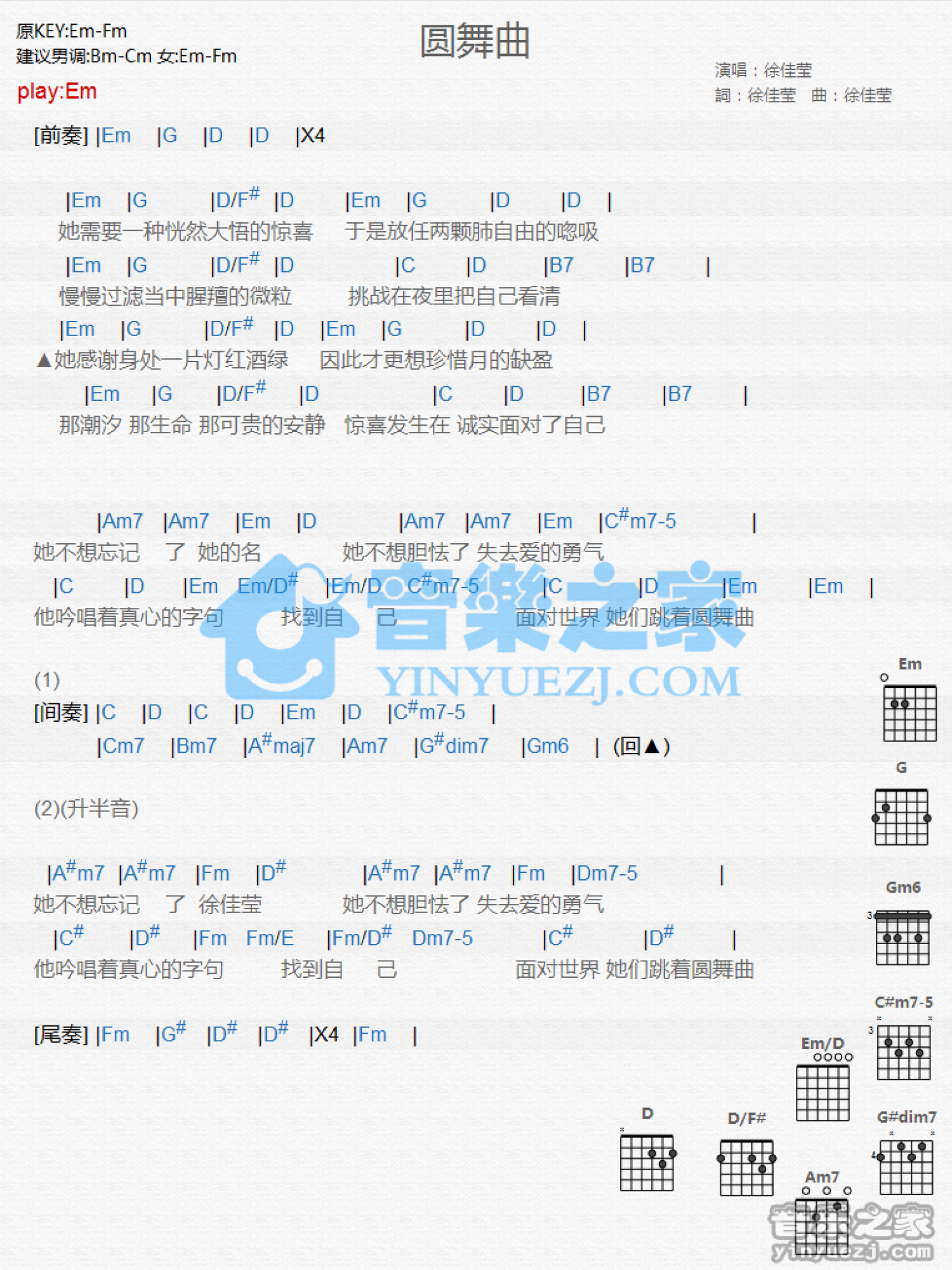 曲谱介绍: Em调版 徐佳莹《圆舞曲》吉他和弦弹唱谱