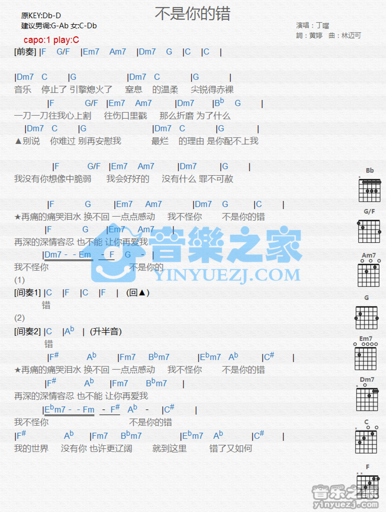 曲谱介绍: C调版 丁当《不是你的错》吉他和弦弹唱谱