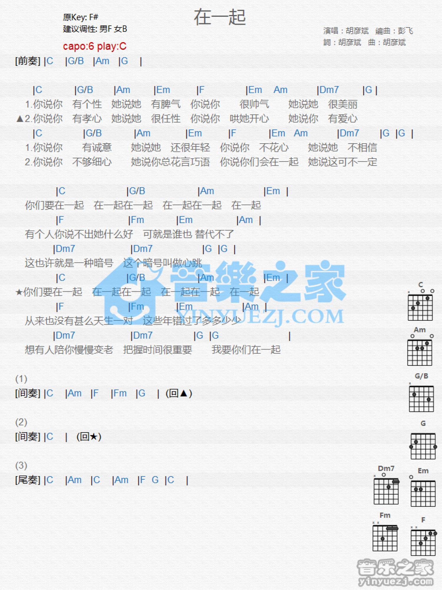 曲谱介绍: C调版 胡彦斌《在一起》吉他和弦弹唱谱