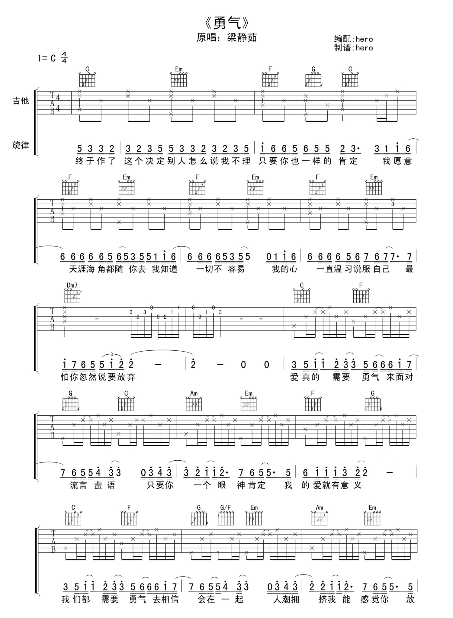 曲谱介绍: 梁静茹勇气吉他谱C调高清版