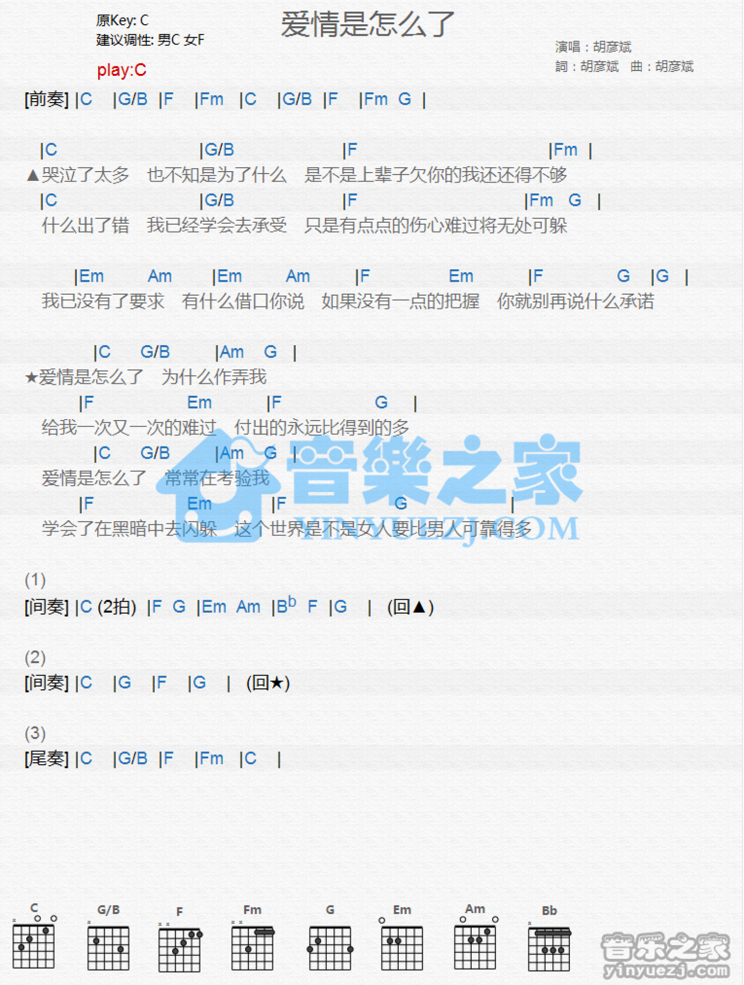 爱情是怎么了吉他谱 - 胡彦斌 - C调吉他弹唱谱 - 和弦谱
