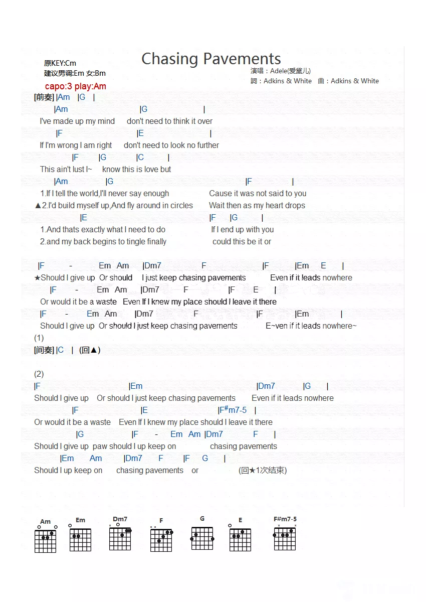 曲谱介绍: Am调版 阿黛尔《Chasing Pavements》吉他和弦弹唱谱