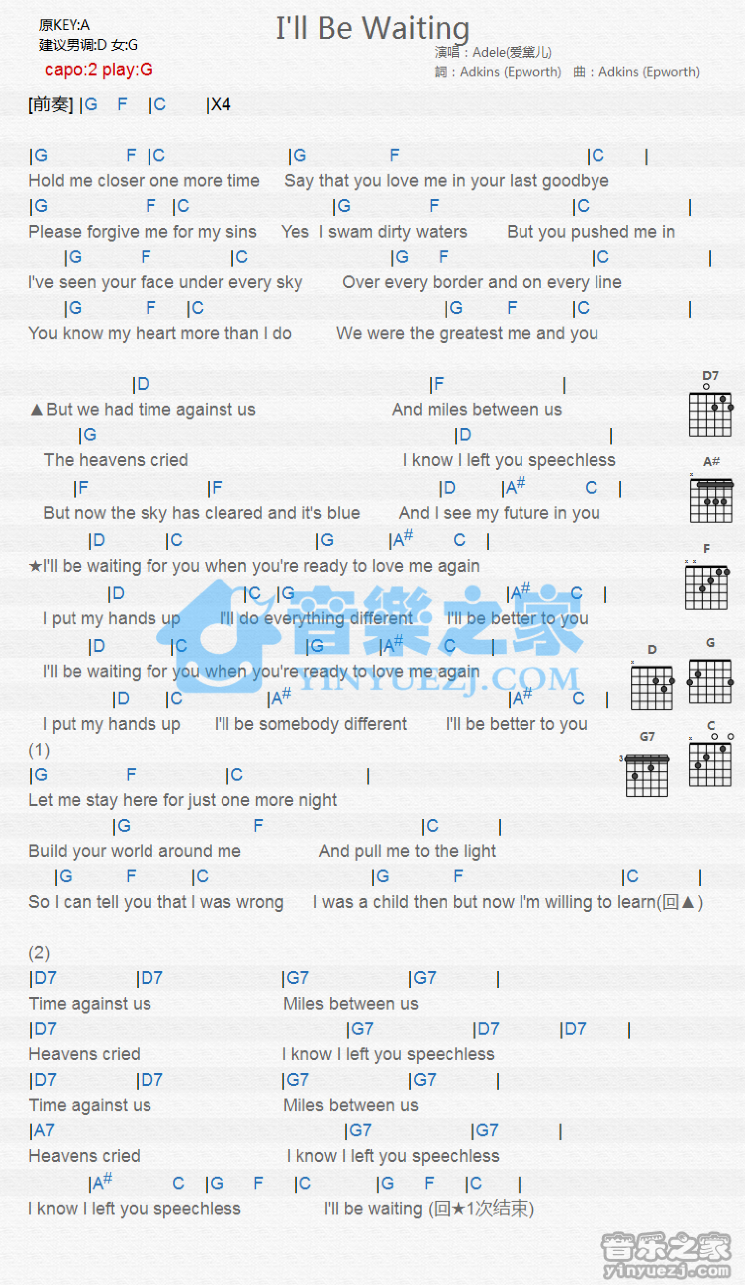 曲谱介绍: G调版 阿黛尔《I'll Be Waiting》吉他和弦弹唱谱