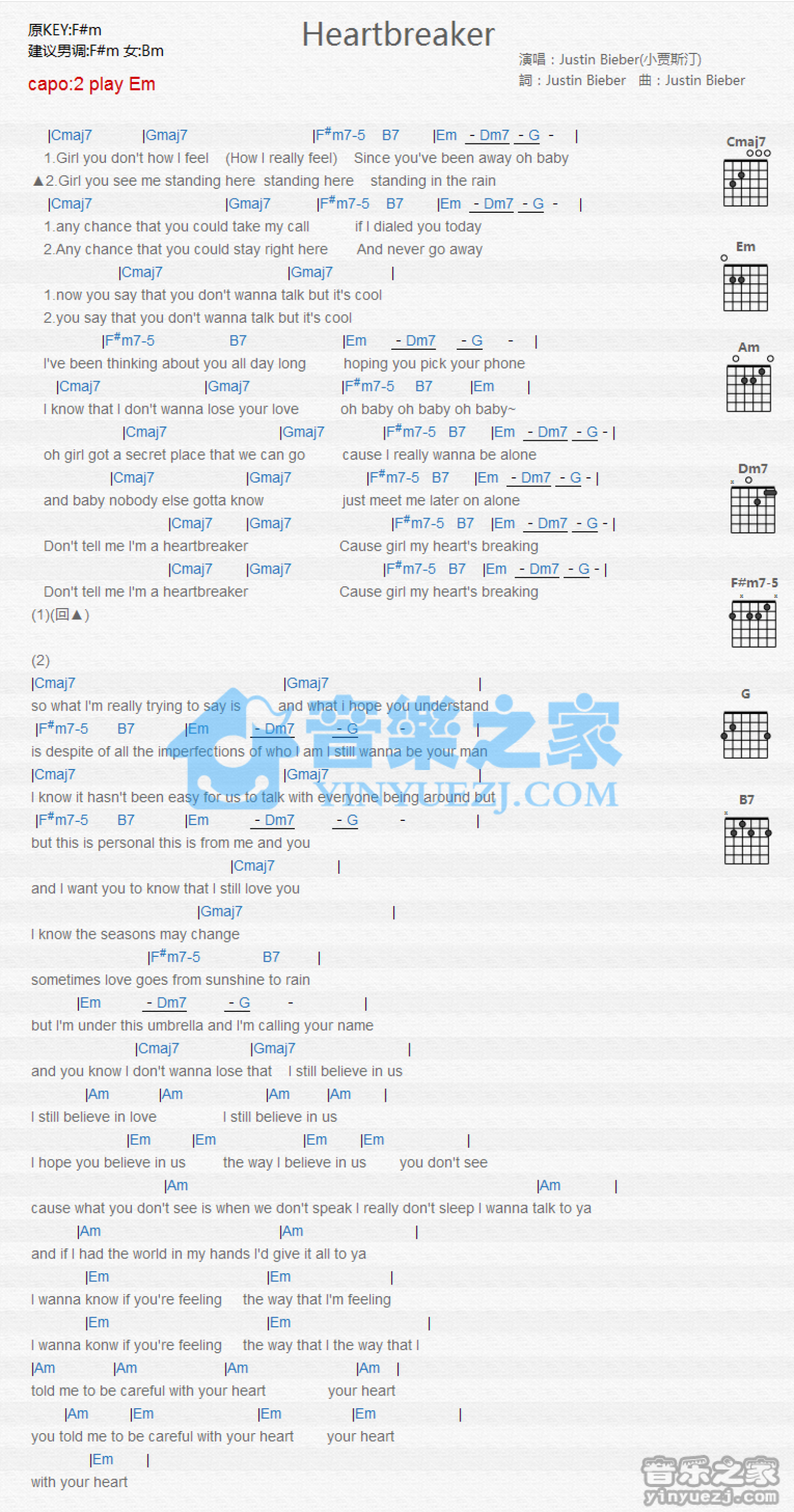 曲谱介绍: Em调版 Justin Bieber《Heartbreaker》吉他和弦弹唱谱