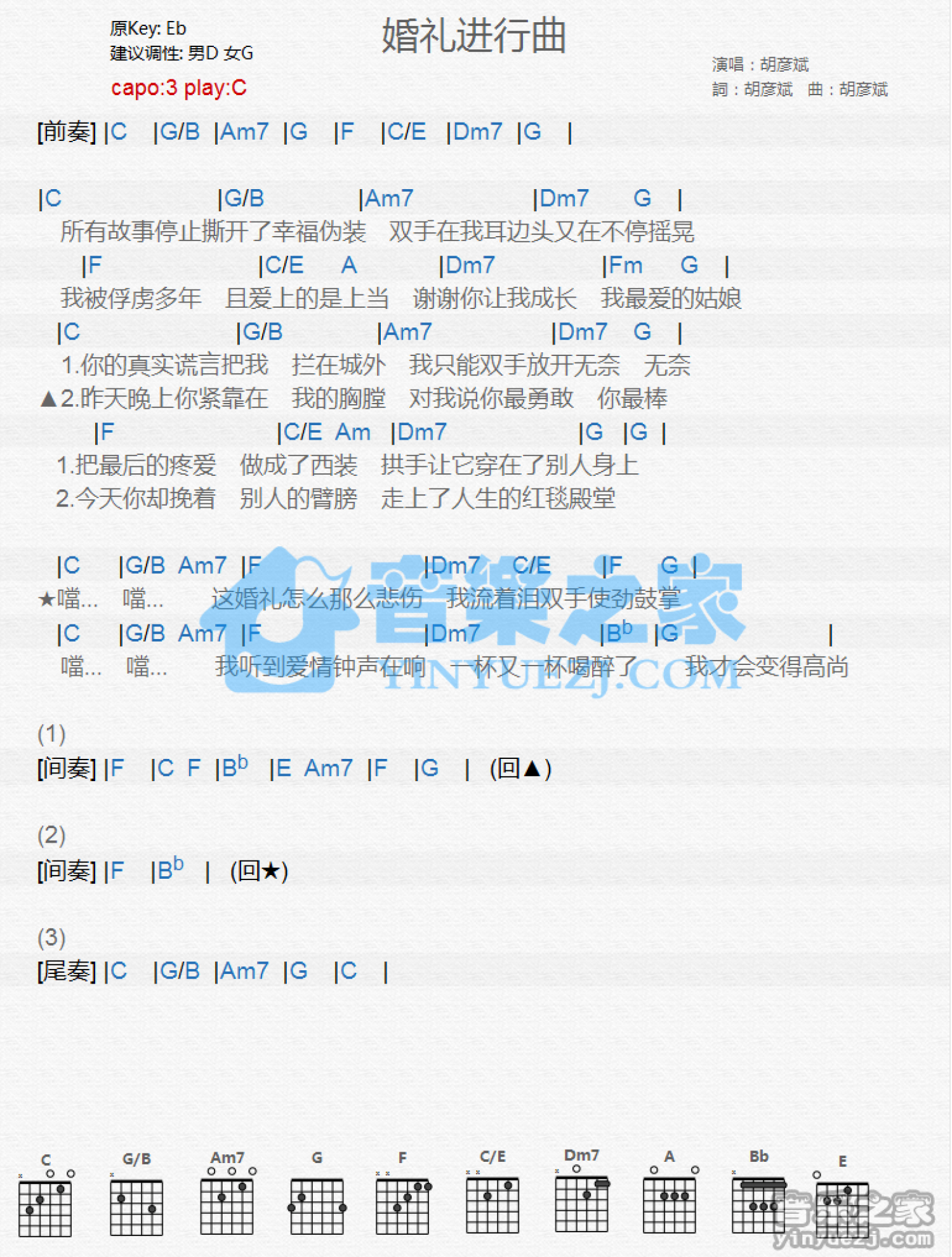 曲谱介绍: C调版 胡彦斌《婚礼进行曲》吉他和弦弹唱谱
