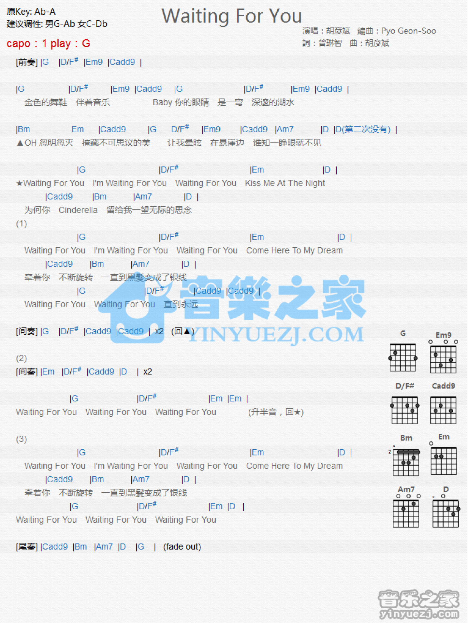 曲谱介绍: G调版胡彦斌《WaitingForYou》吉他和弦弹唱谱