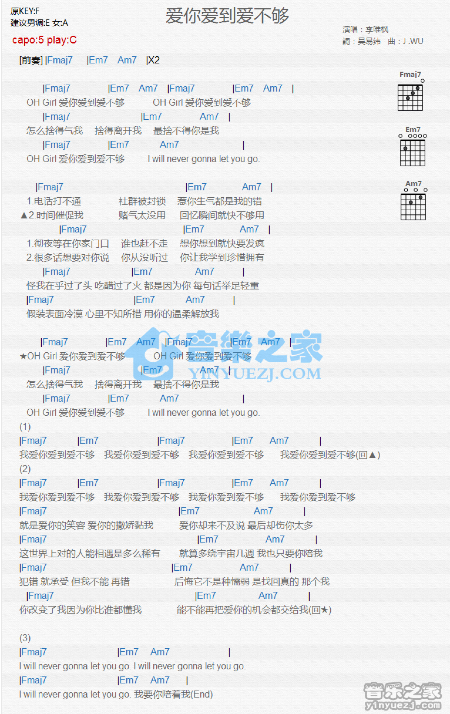 曲谱介绍: C调版李唯枫《爱你爱到爱不够》吉他和弦弹唱谱