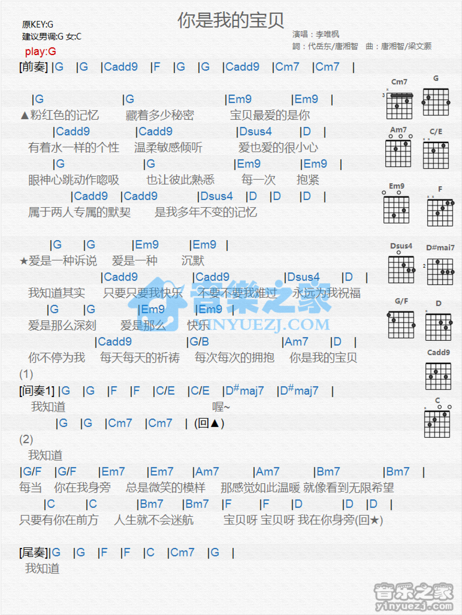 曲谱介绍: G调版李唯枫《你是我的宝贝》吉他和弦弹唱谱
