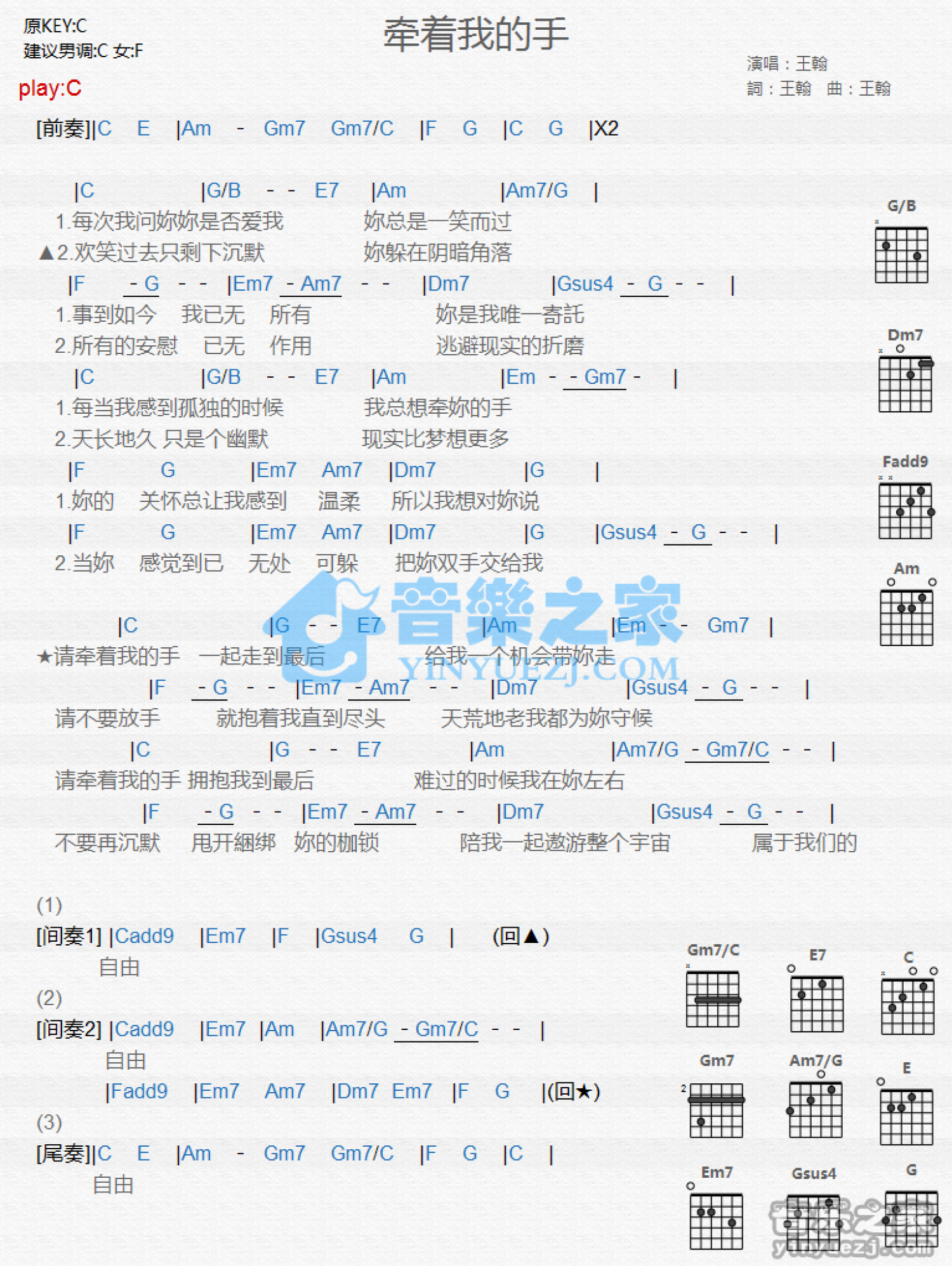 牵着我的手吉他谱 - 王翰 - C调吉他弹唱谱 - 和弦谱