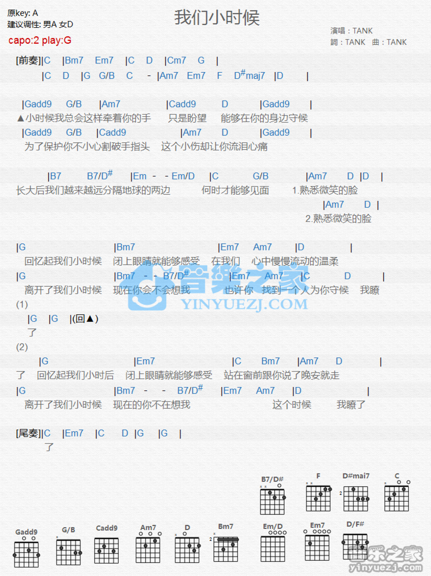 曲谱介绍: G调版 TANK《我们小时候》吉他和弦弹唱谱