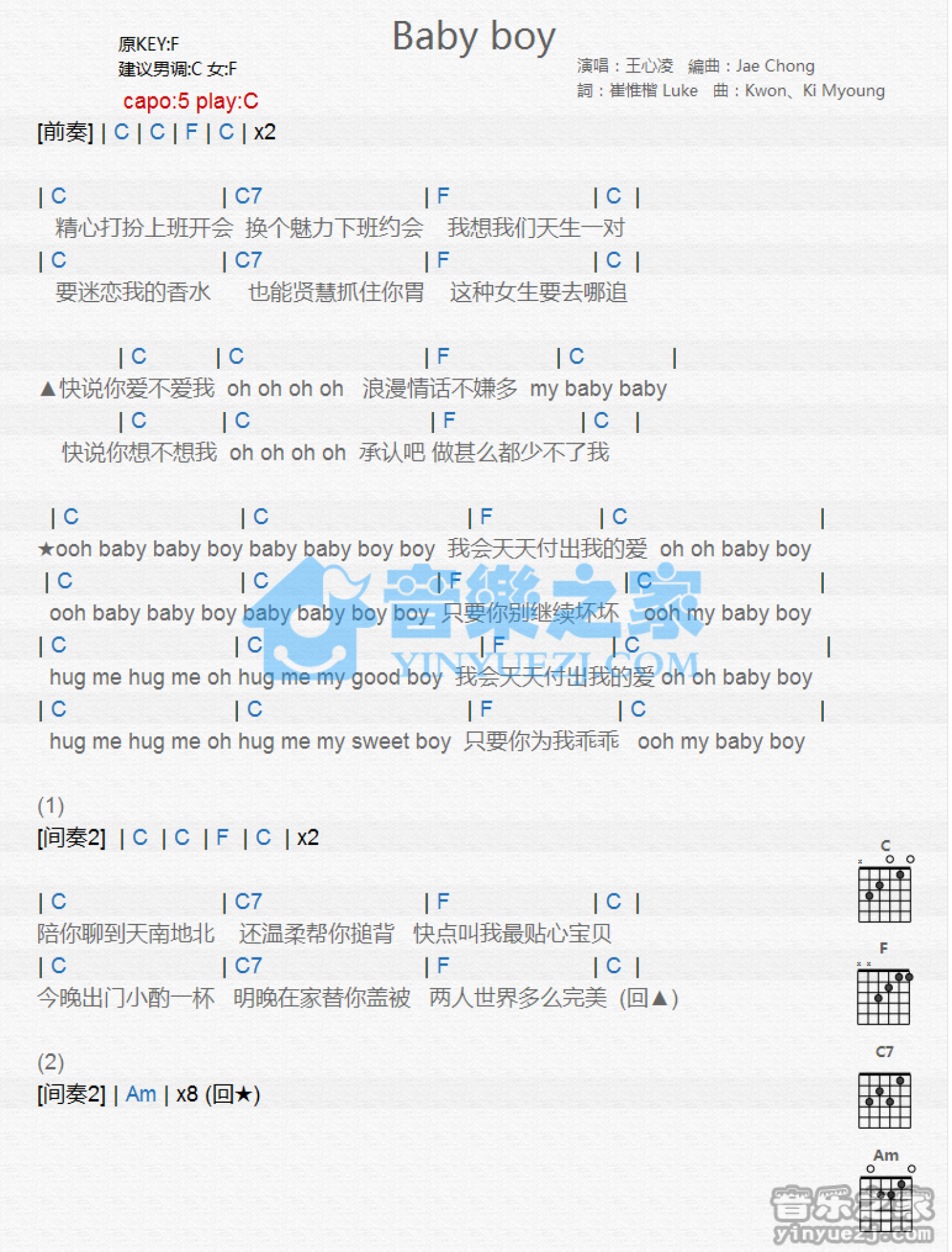 曲谱介绍: C调版 王心凌《Baby Boy》吉他和弦弹唱谱