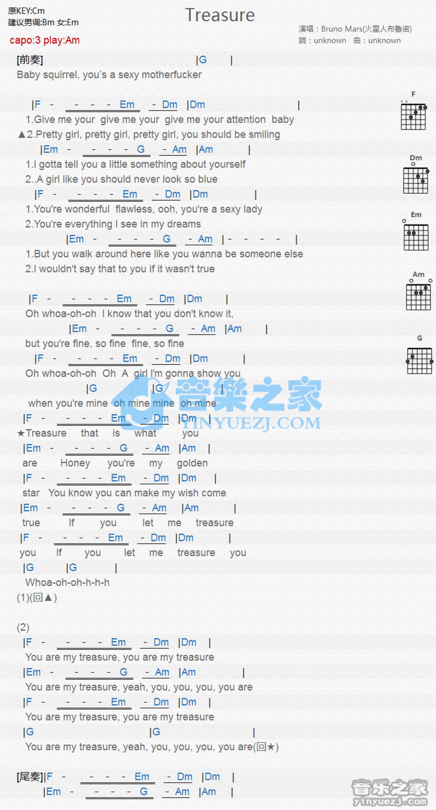 曲谱介绍: Am调版 Bruno Mars《Treasure》吉他和弦弹唱谱