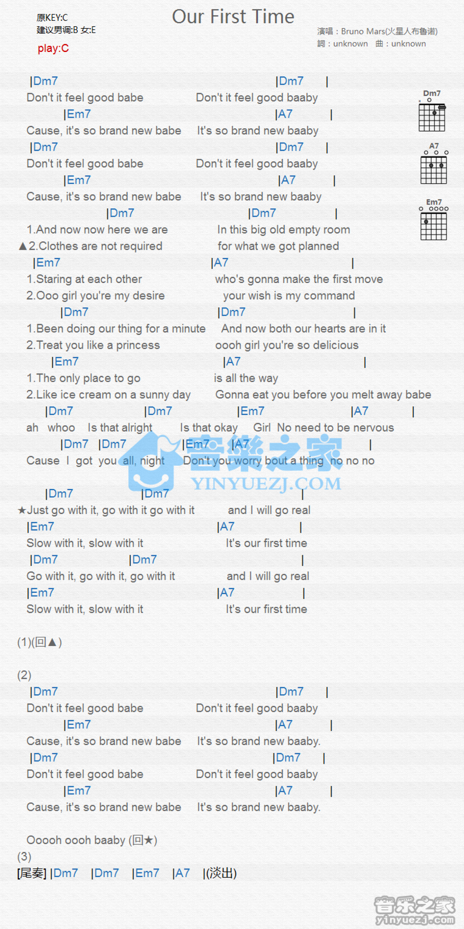 曲谱介绍: C调版 Bruno Mars《Our First Time》吉他和弦弹唱谱