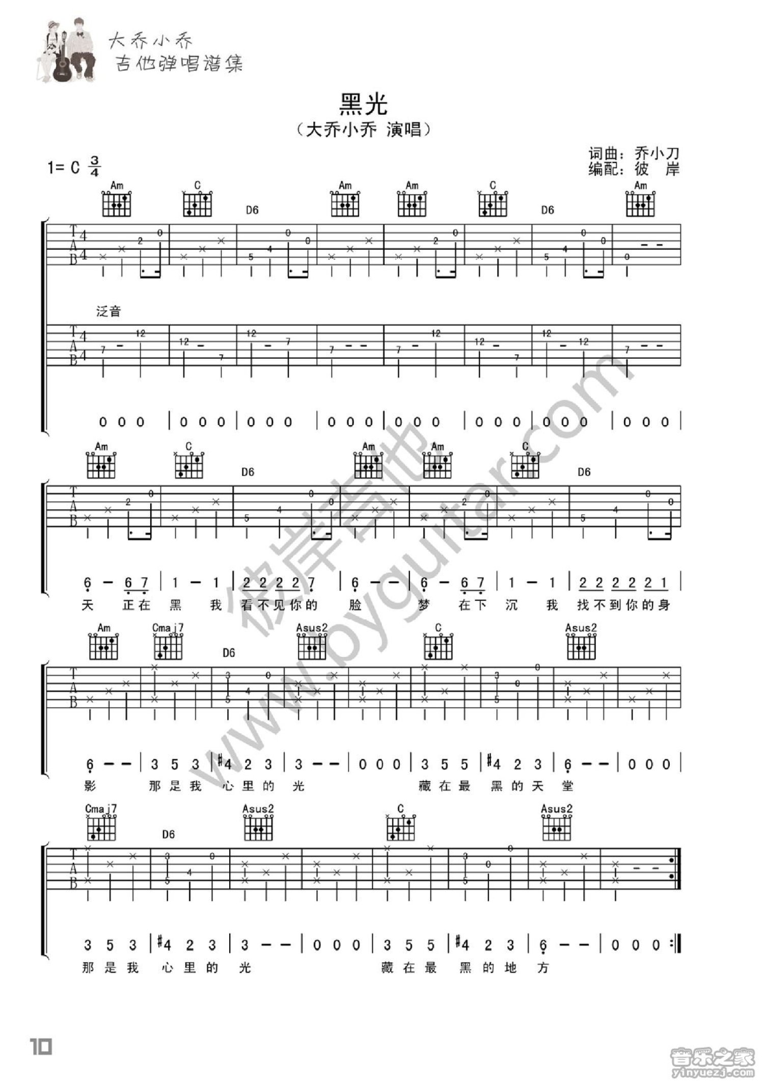 曲谱介绍: 彼岸C调双吉他版 大乔小乔《黑光》吉他弹唱六线谱