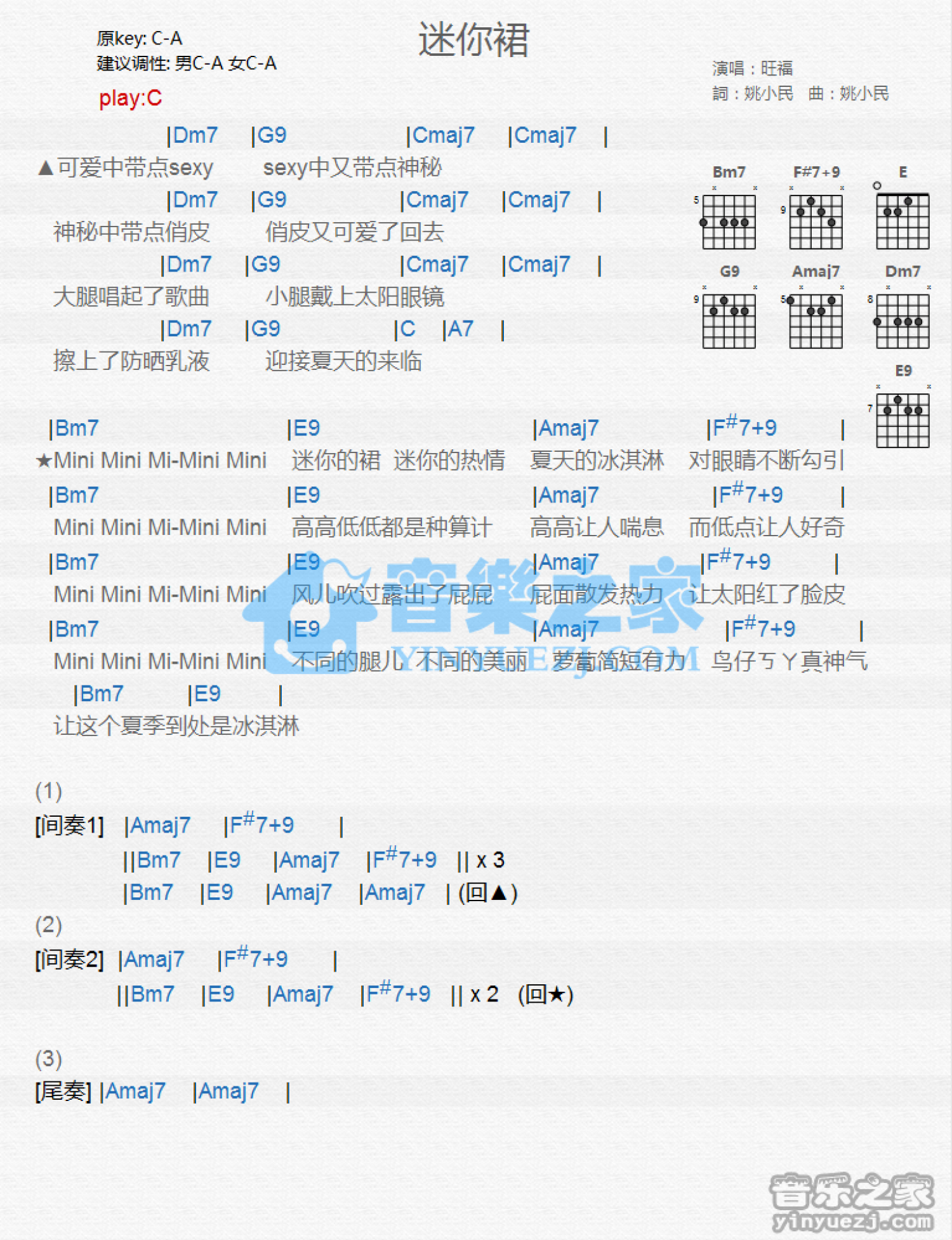 曲谱介绍: C调版 旺福乐队《迷你裙》吉他和弦弹唱谱