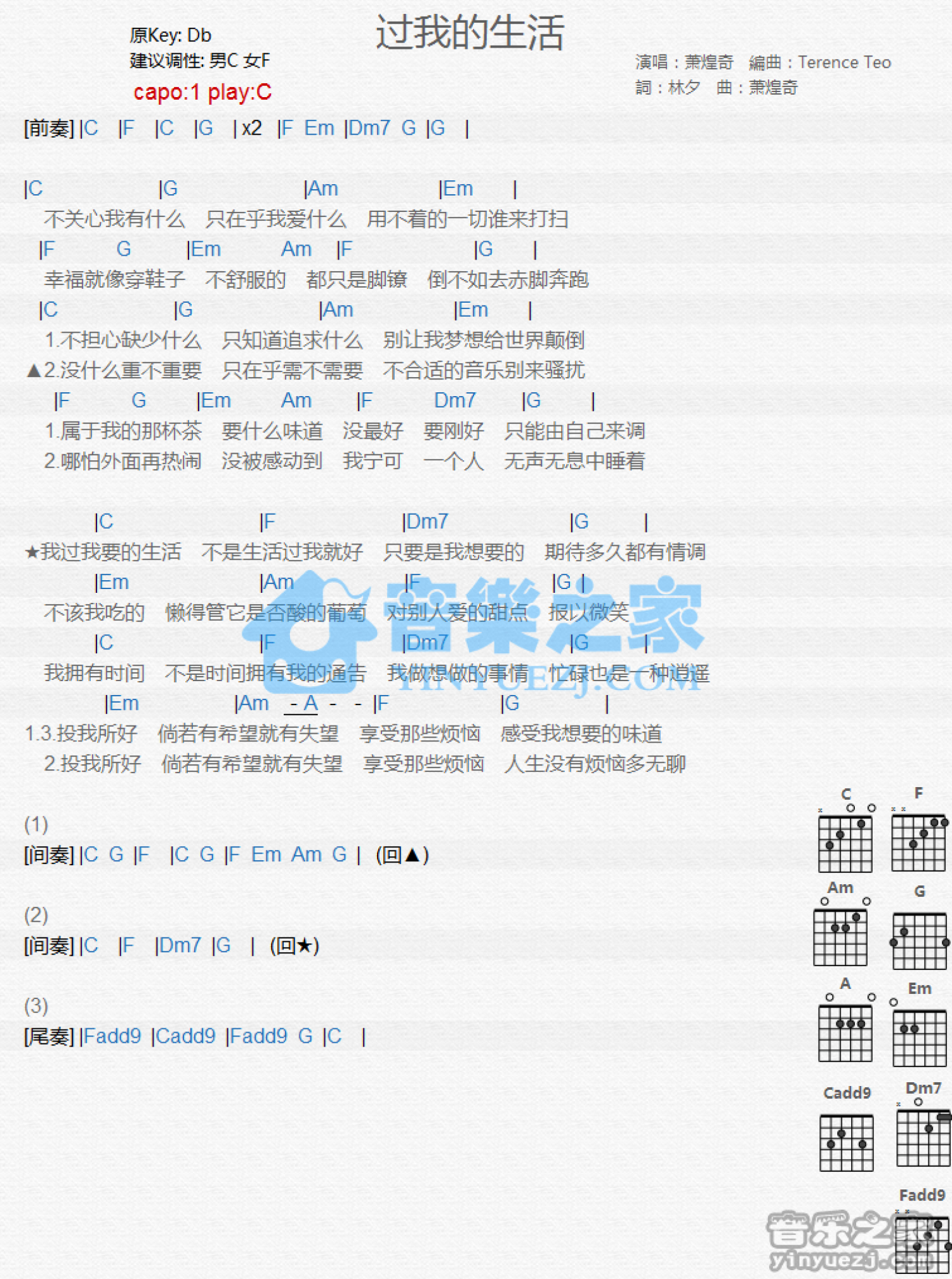 曲谱介绍: C调版 萧煌奇《过我的生活》吉他和弦弹唱谱