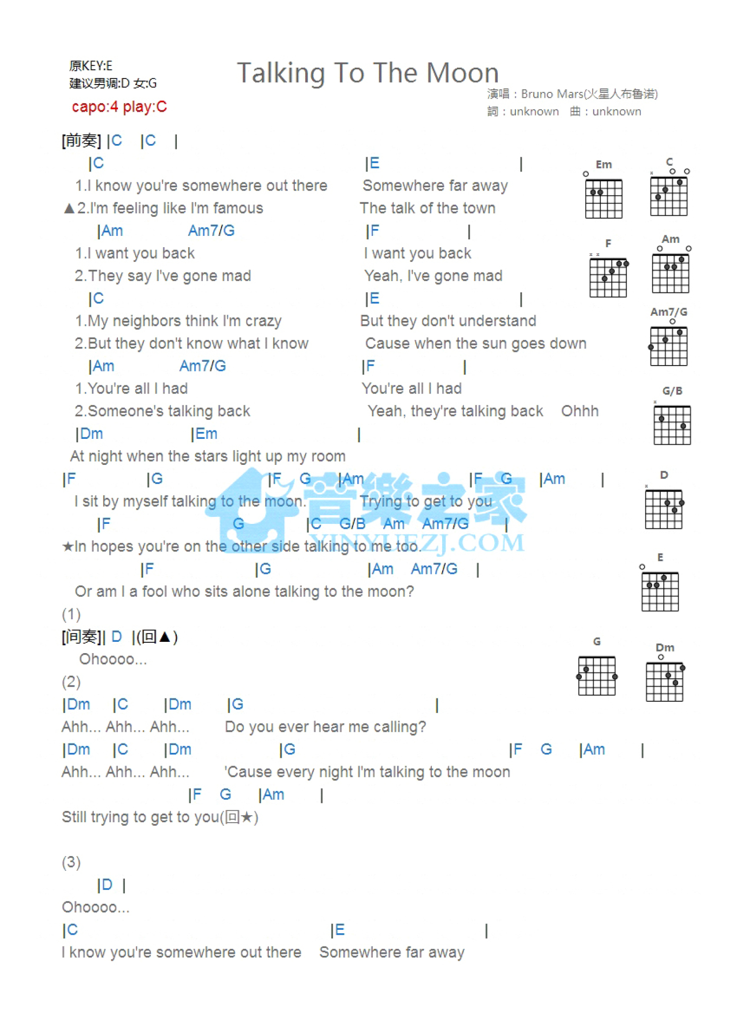 曲谱介绍: C调版 Bruno Mars《Talking To The Moon》吉他和弦弹唱谱
