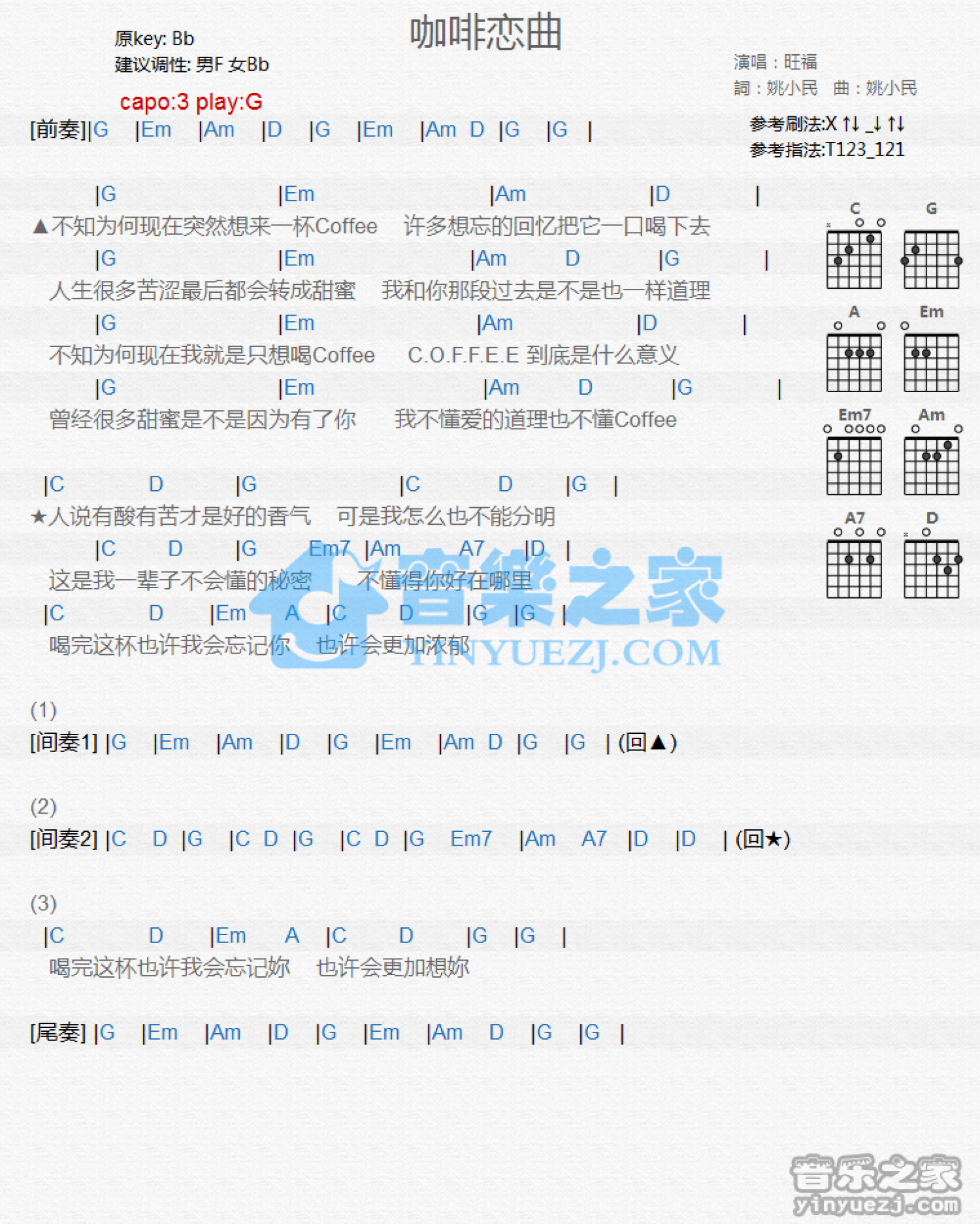 曲谱介绍: G调版 旺福乐队《咖啡恋曲》吉他和弦弹唱谱
