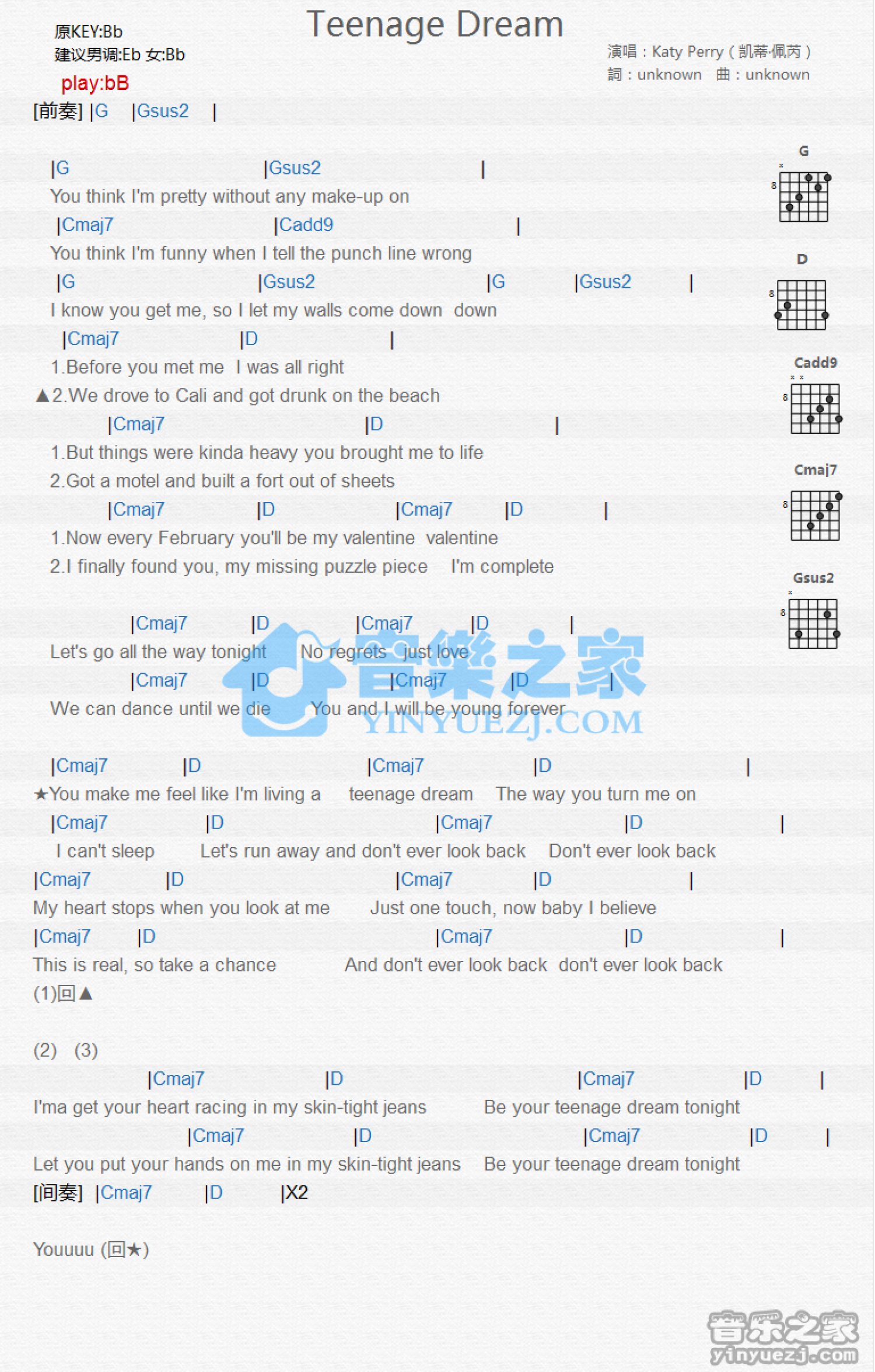 曲谱介绍: bB调版 Katy Perry《Teenage Dream》吉他和弦弹唱谱