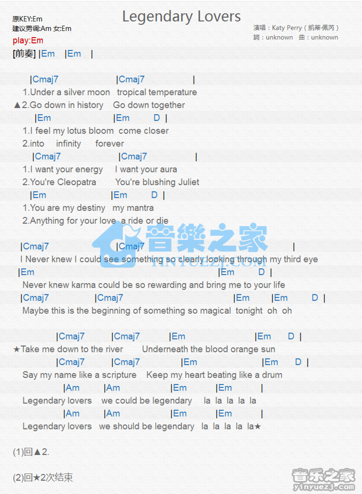 曲谱介绍: Em调版 Katy Perry《Legendary Lovers》吉他和弦弹唱谱