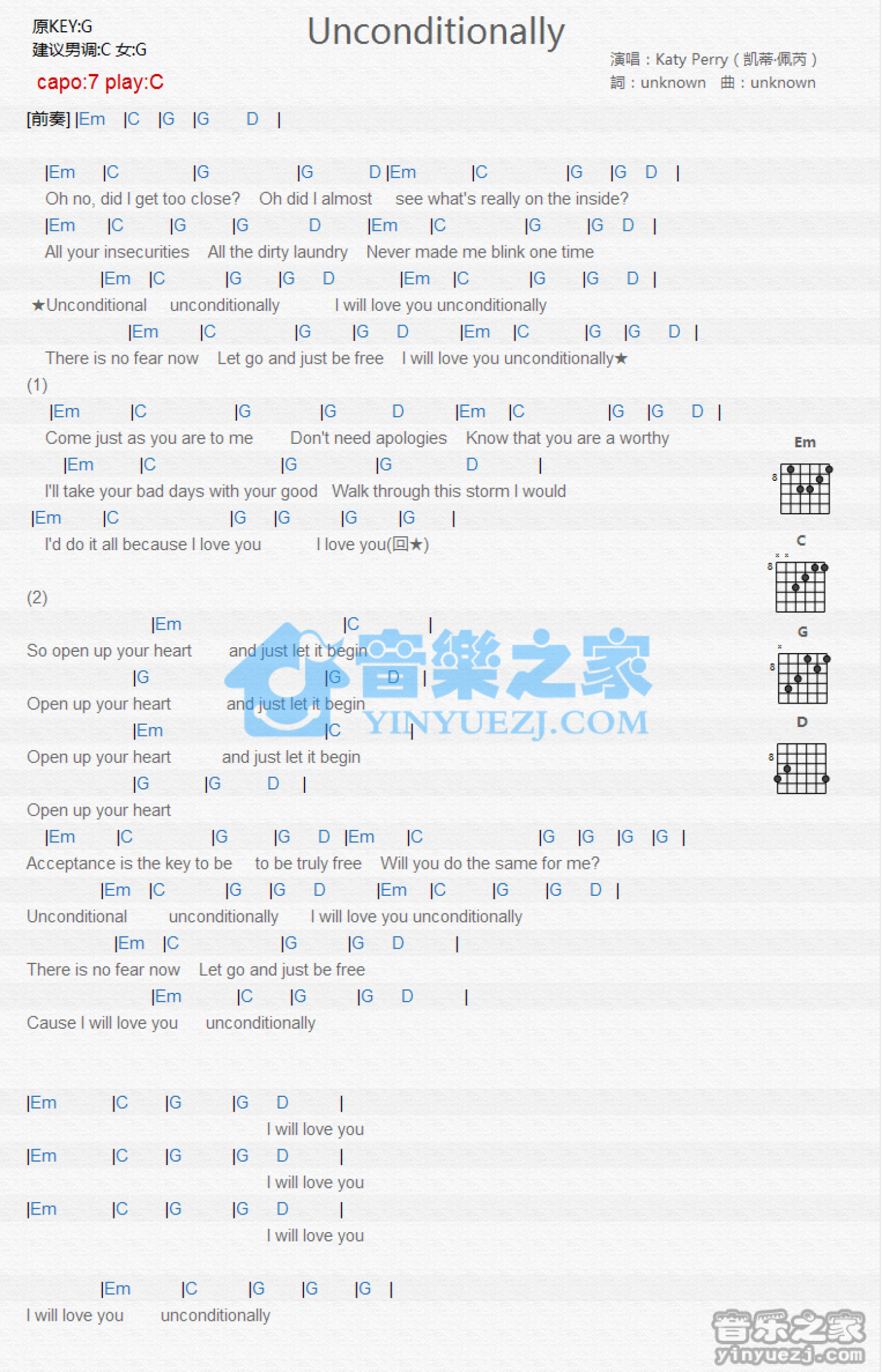 曲谱介绍: C调版 Katy Perry《Unconditionally》吉他和弦弹唱谱