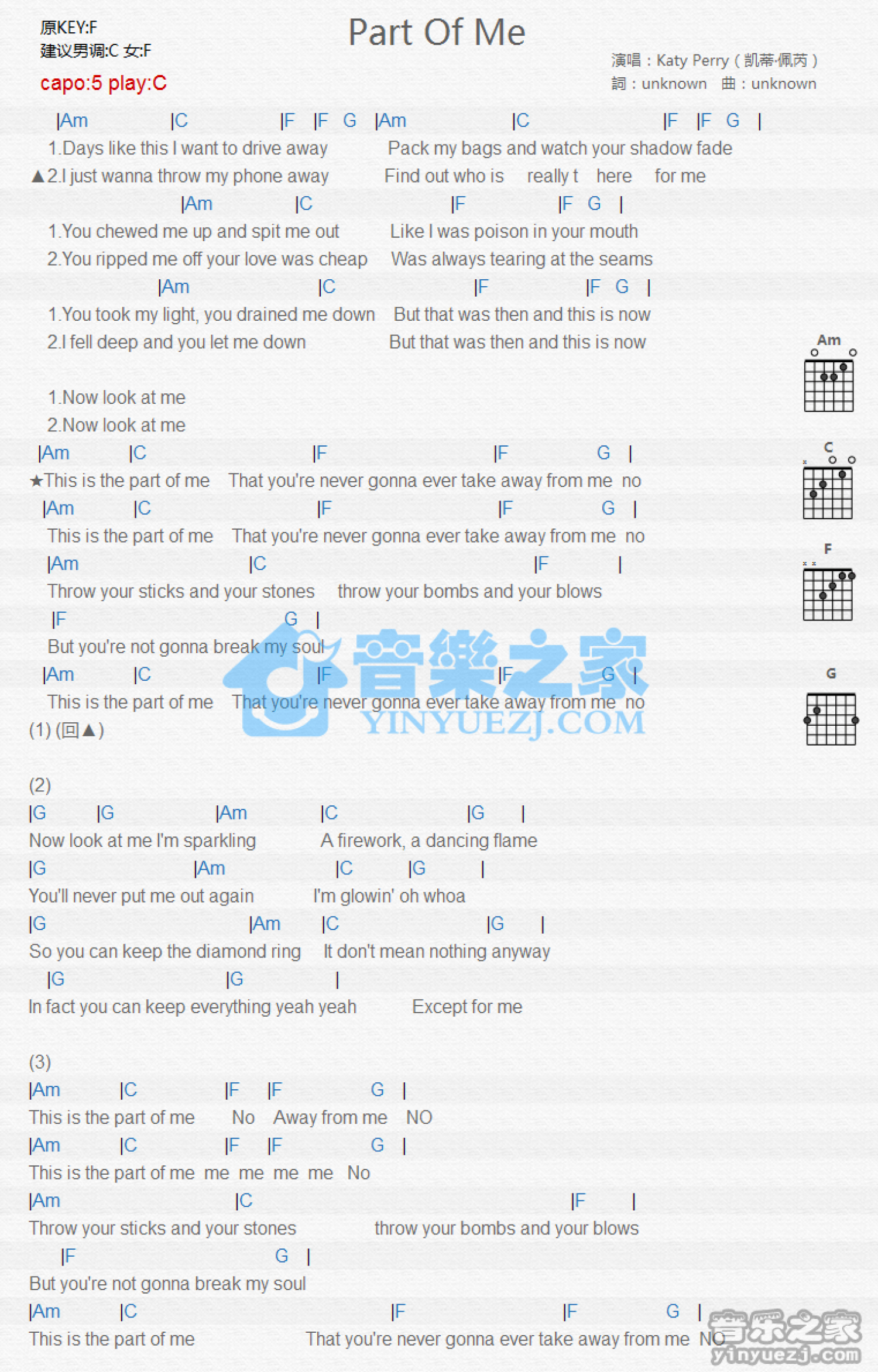 曲谱介绍: C调版 Katy Perry《Part of Me》吉他和弦弹唱谱