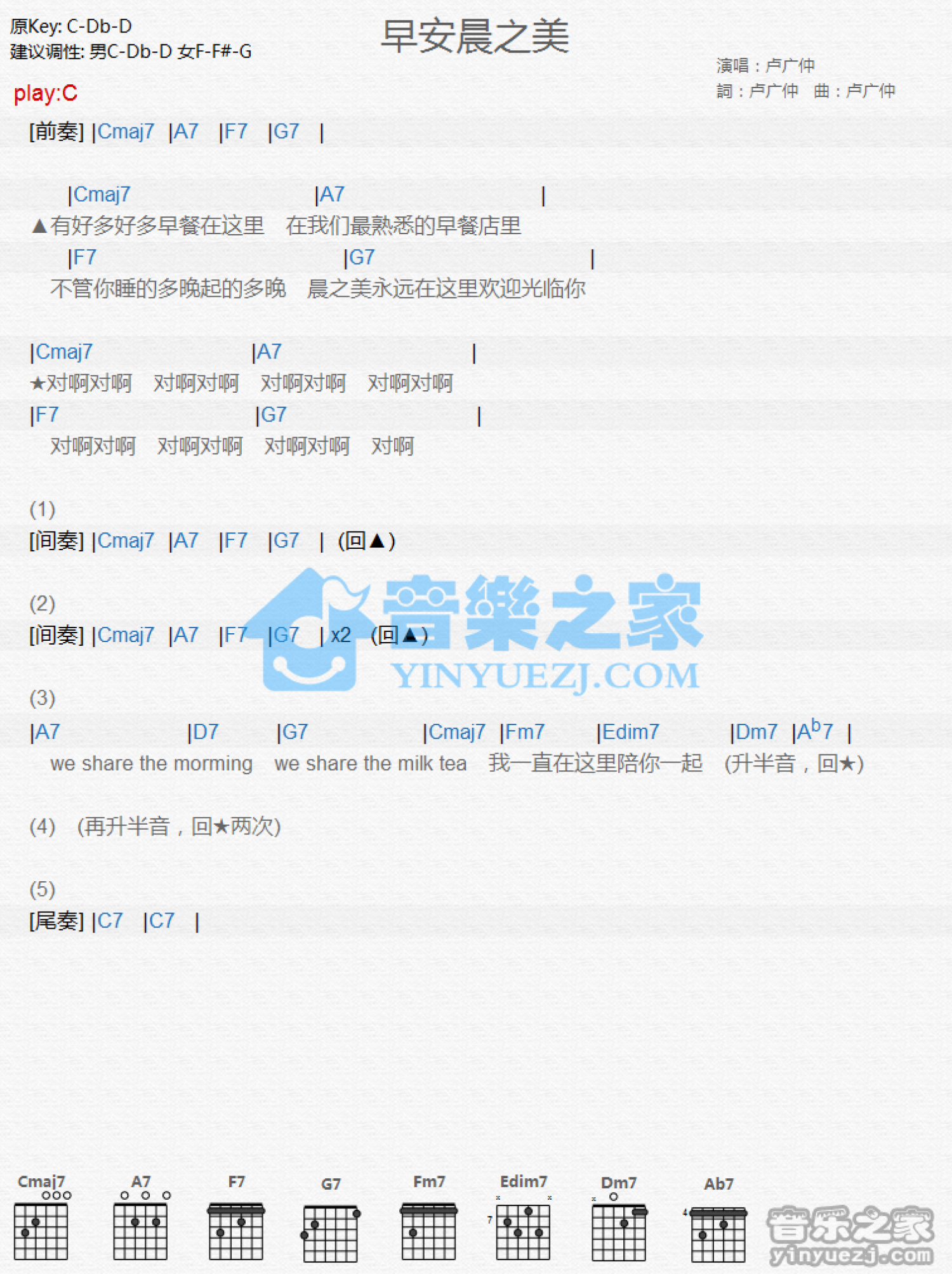曲谱介绍: C调版 卢广仲《早安晨之美》吉他和弦弹唱谱