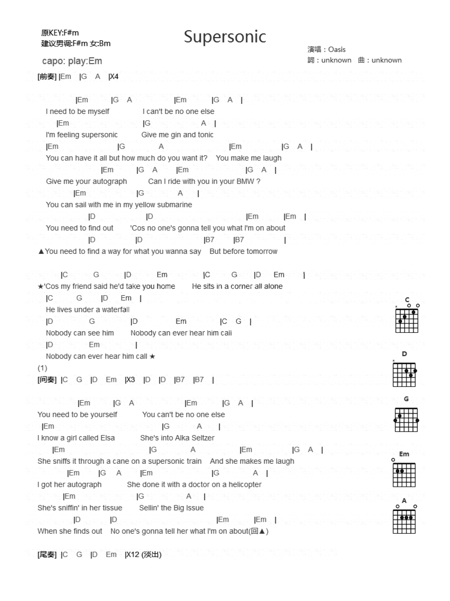 曲谱介绍: Em调版 Oasis《Supersonic》吉他和弦弹唱谱