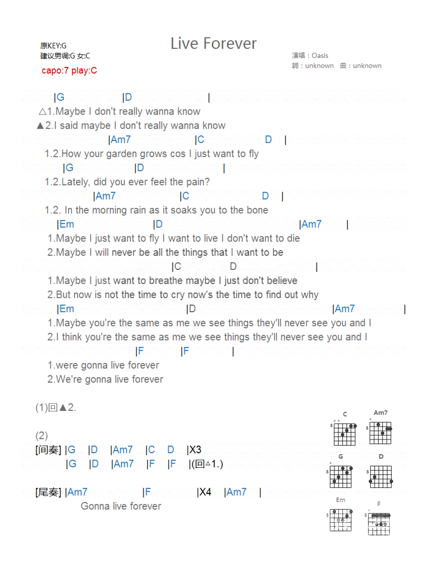 曲谱介绍: C调版 Oasis《LIve Forever》吉他和弦弹唱谱