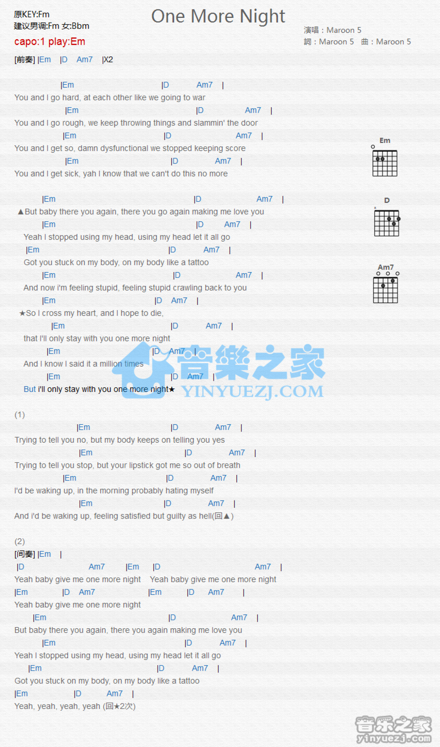 曲谱介绍: Em调版 Maroon 5《One More Night》吉他和弦弹唱谱