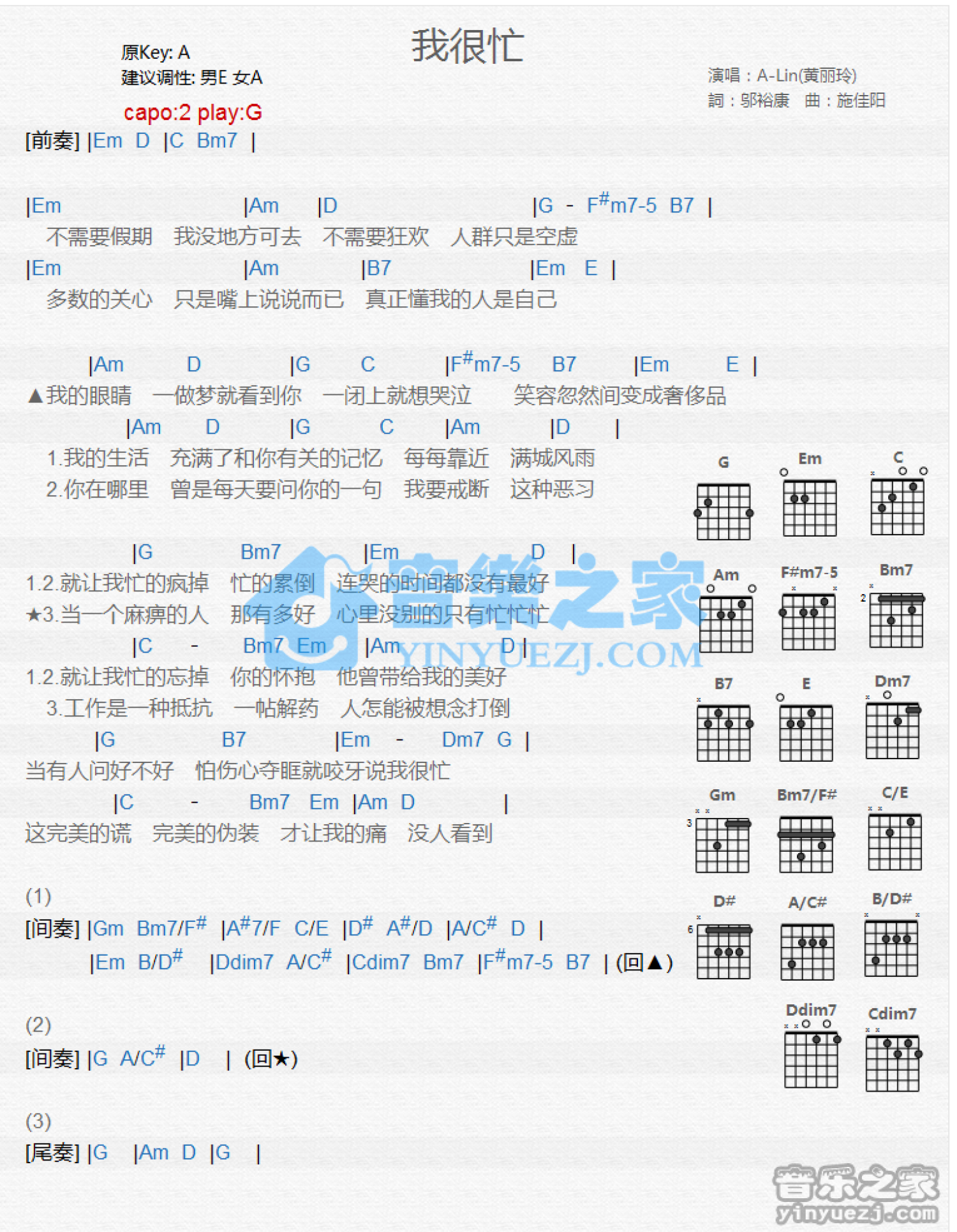 我很忙吉他谱 - A-Lin - G调吉他弹唱谱 - 和弦谱