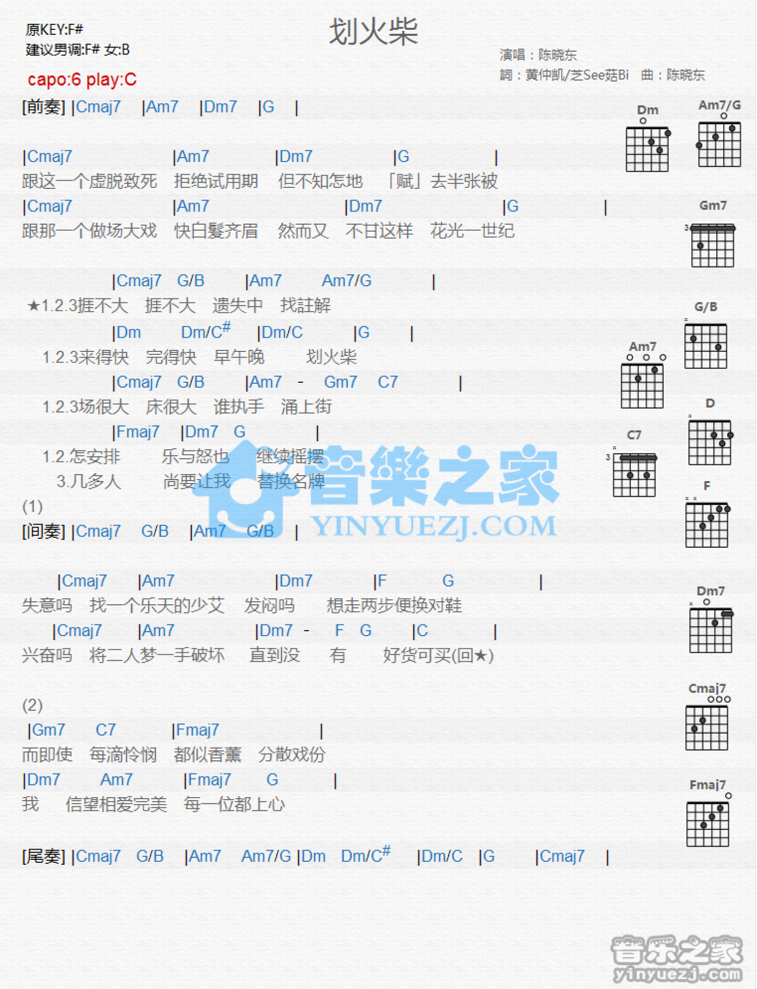 曲谱介绍: C调版陈晓东《划火柴》吉他和弦弹唱谱