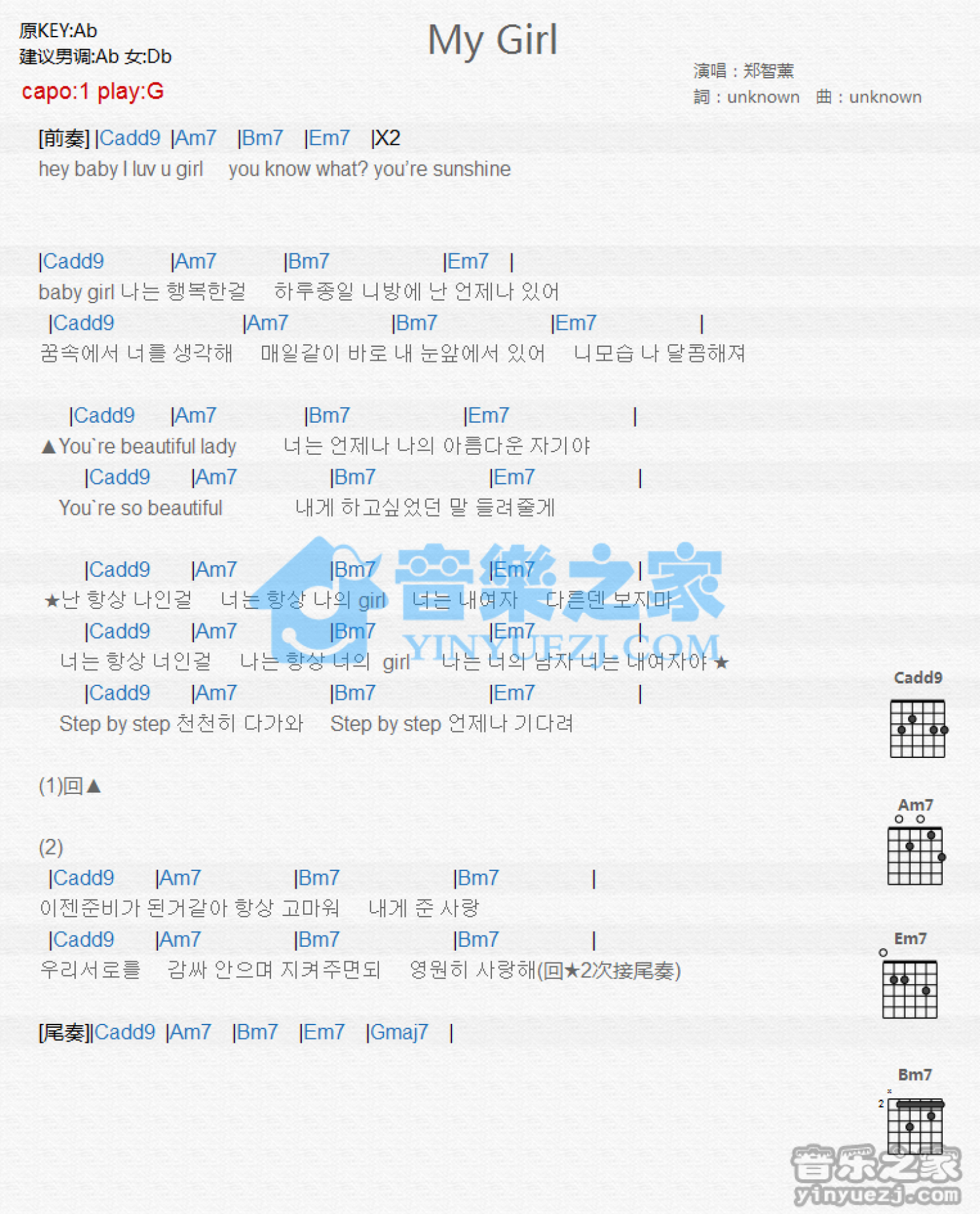 曲谱介绍: G调版 郑智慧《My Girl》吉他和弦弹唱谱