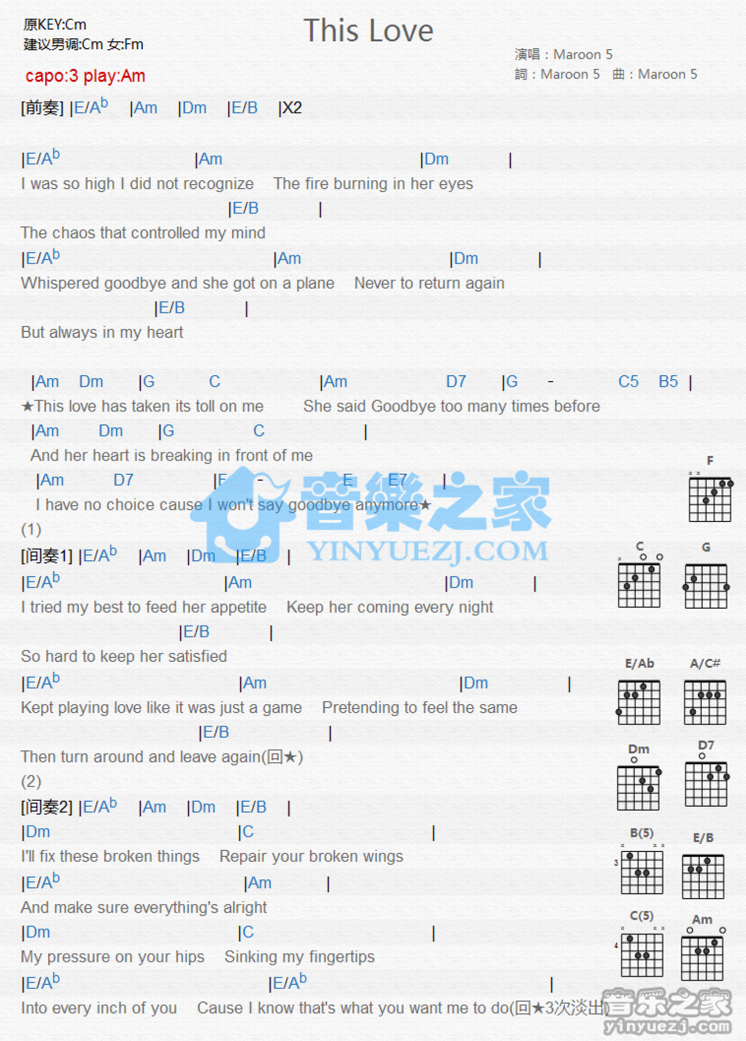 曲谱介绍: Am调版 Maroon 5《This Love》吉他和弦弹唱谱