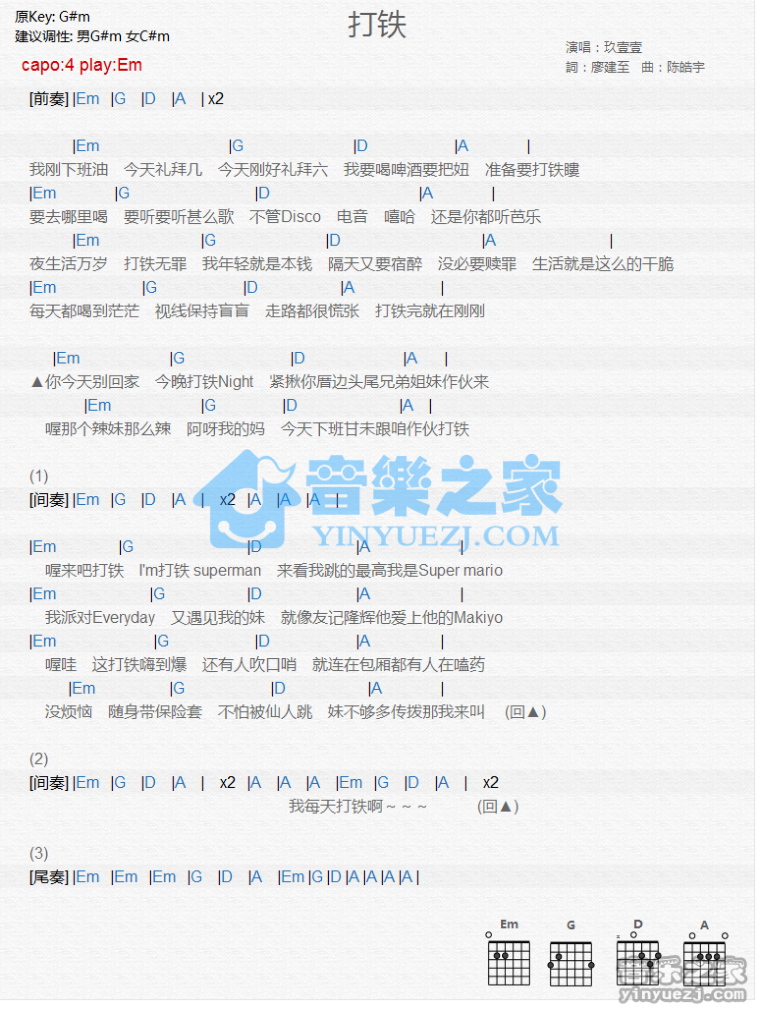 曲谱介绍: Em调版 玖壹壹《打铁》吉他和弦弹唱谱