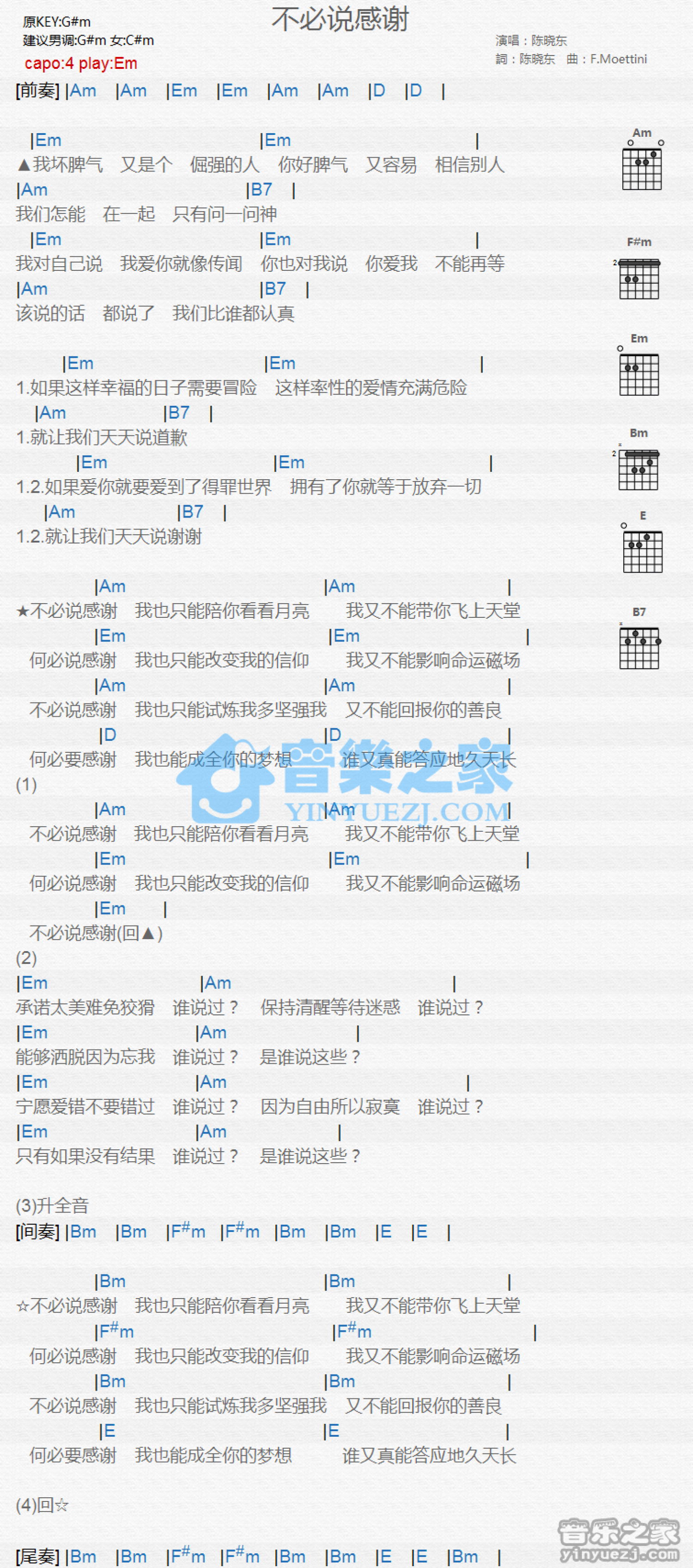 曲谱介绍: Em调版 陈晓东《不必说感谢》吉他和弦弹唱谱