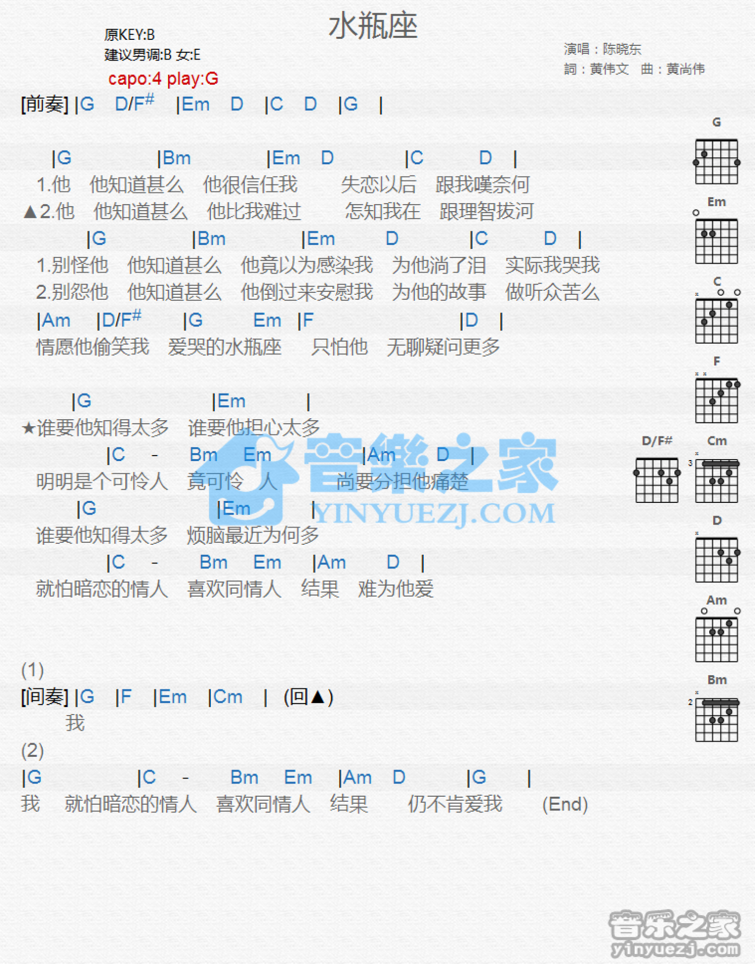 曲谱介绍: G调版 陈晓东《水瓶座》吉他和弦弹唱谱
