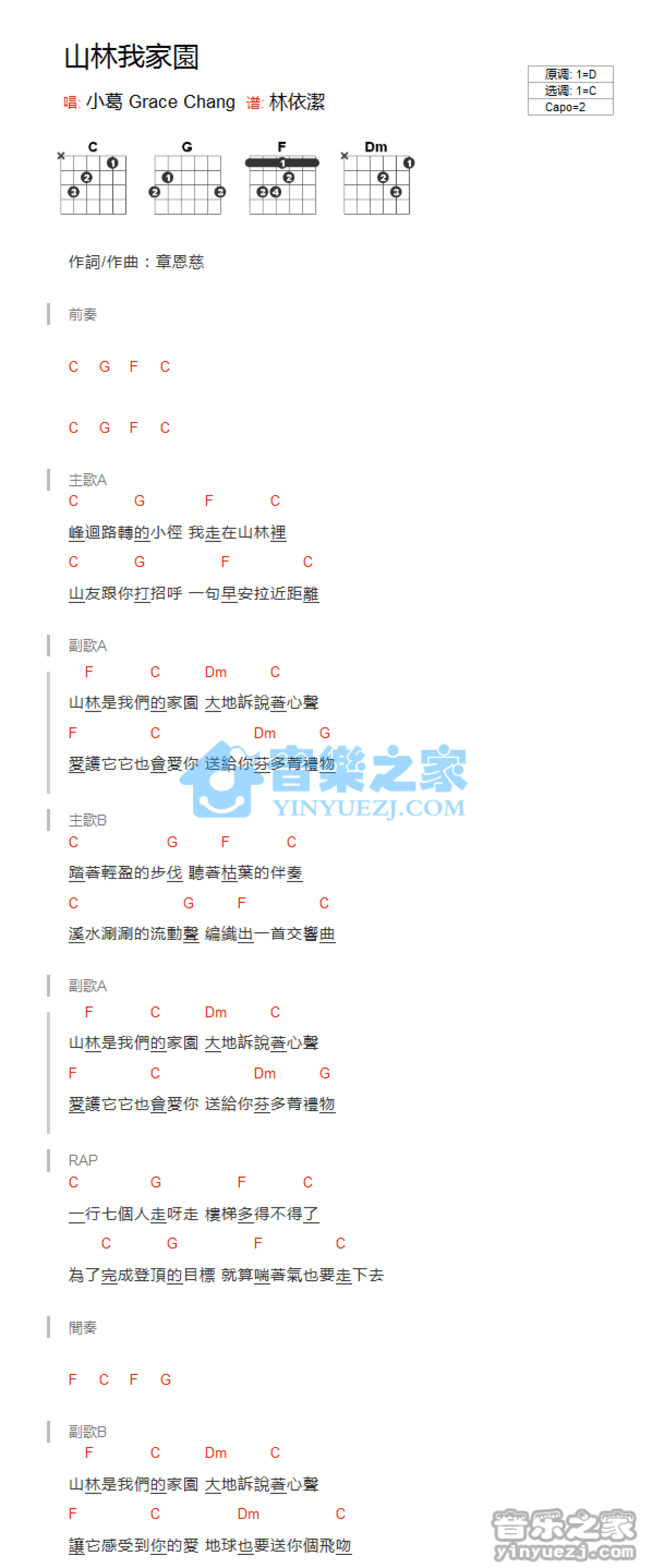 曲谱介绍: C调版 小葛《山林我家园》吉他和弦弹唱谱