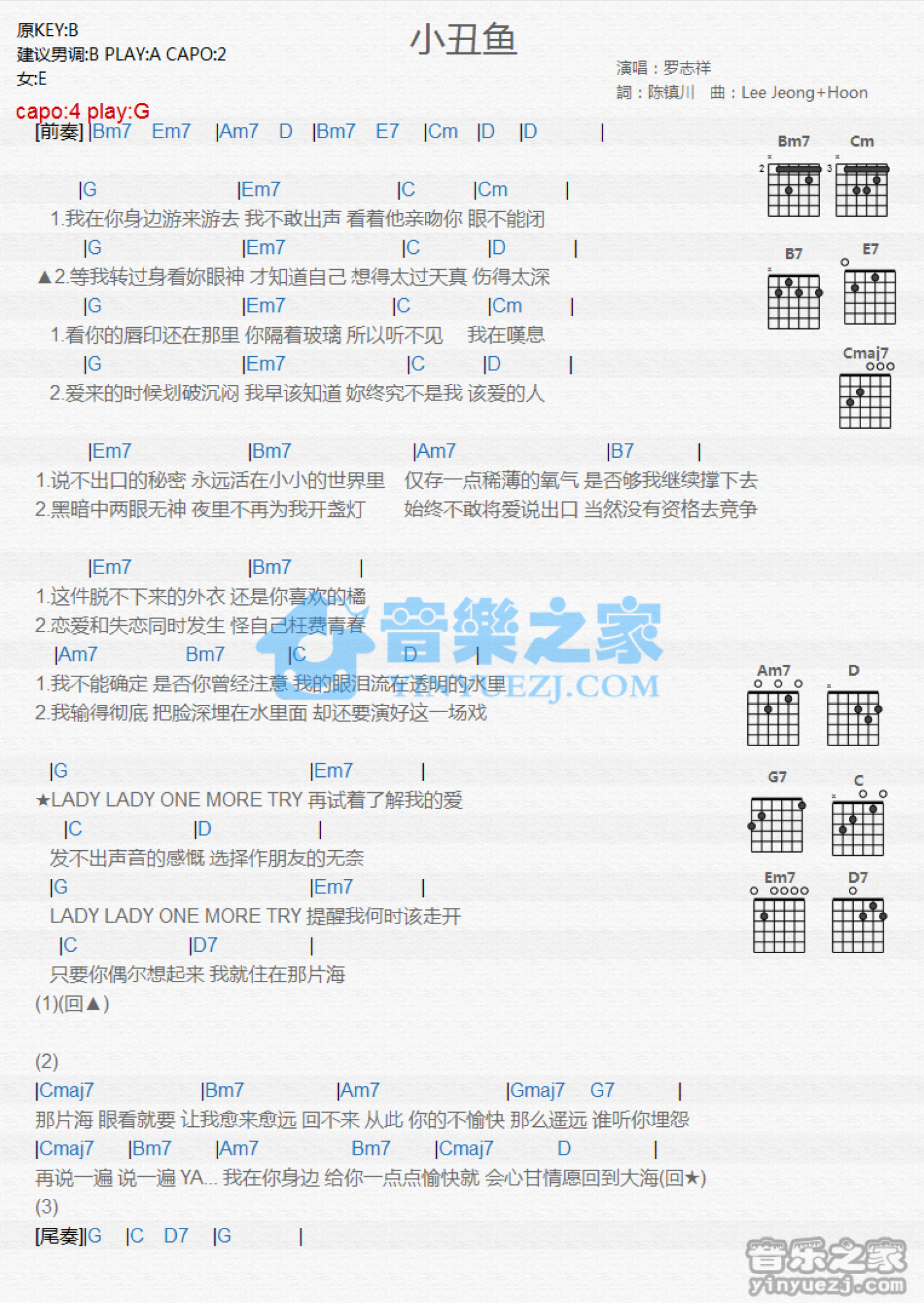 曲谱介绍: G调版 罗志祥《小丑鱼》吉他和弦弹唱谱