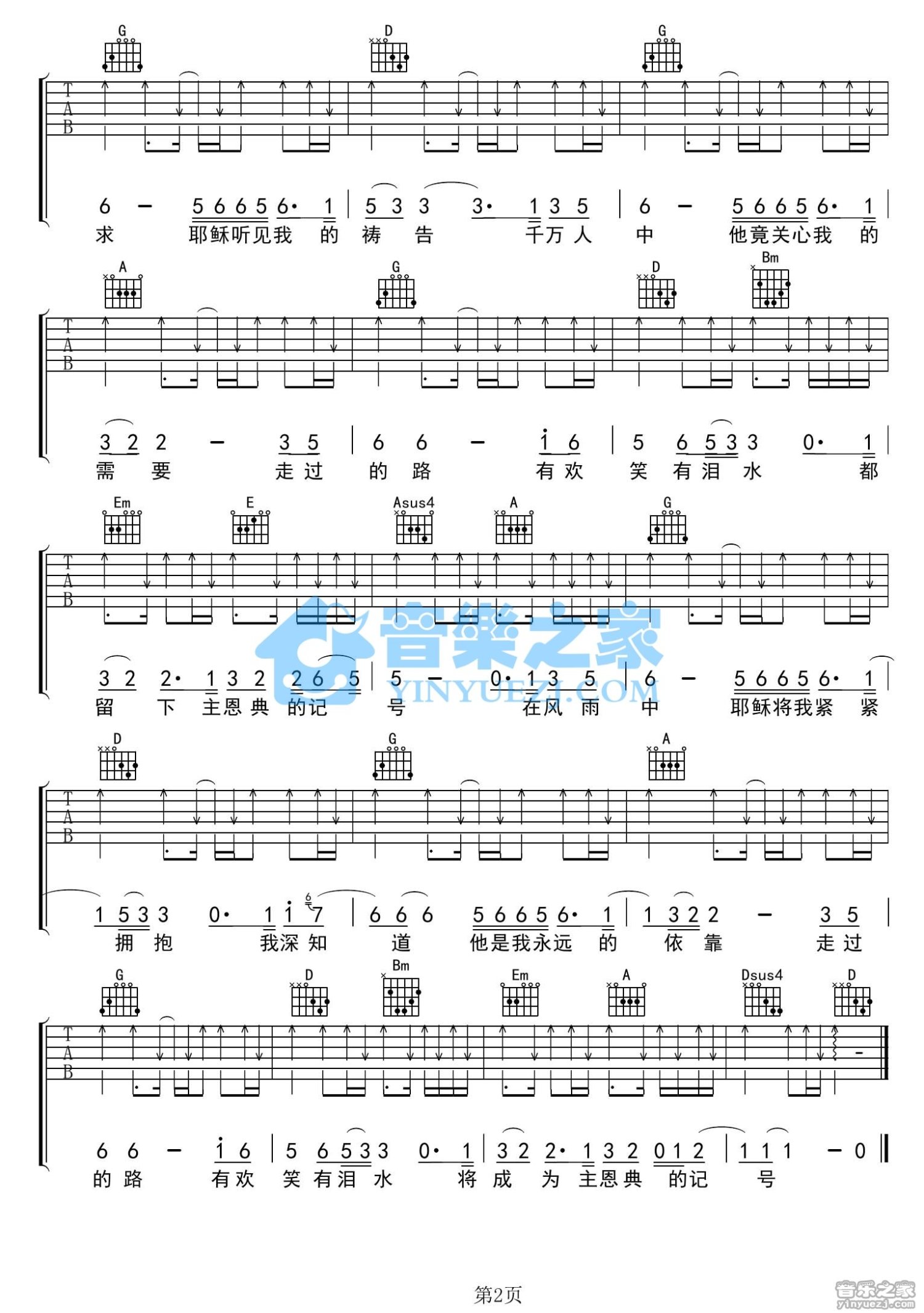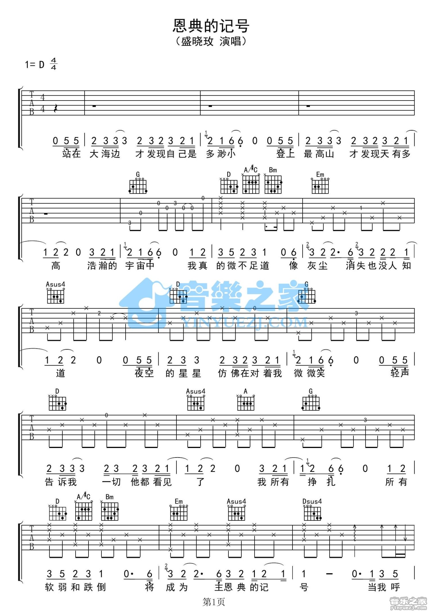 曲谱介绍: D调版 盛晓玫《恩典的记号》吉他弹唱六线谱