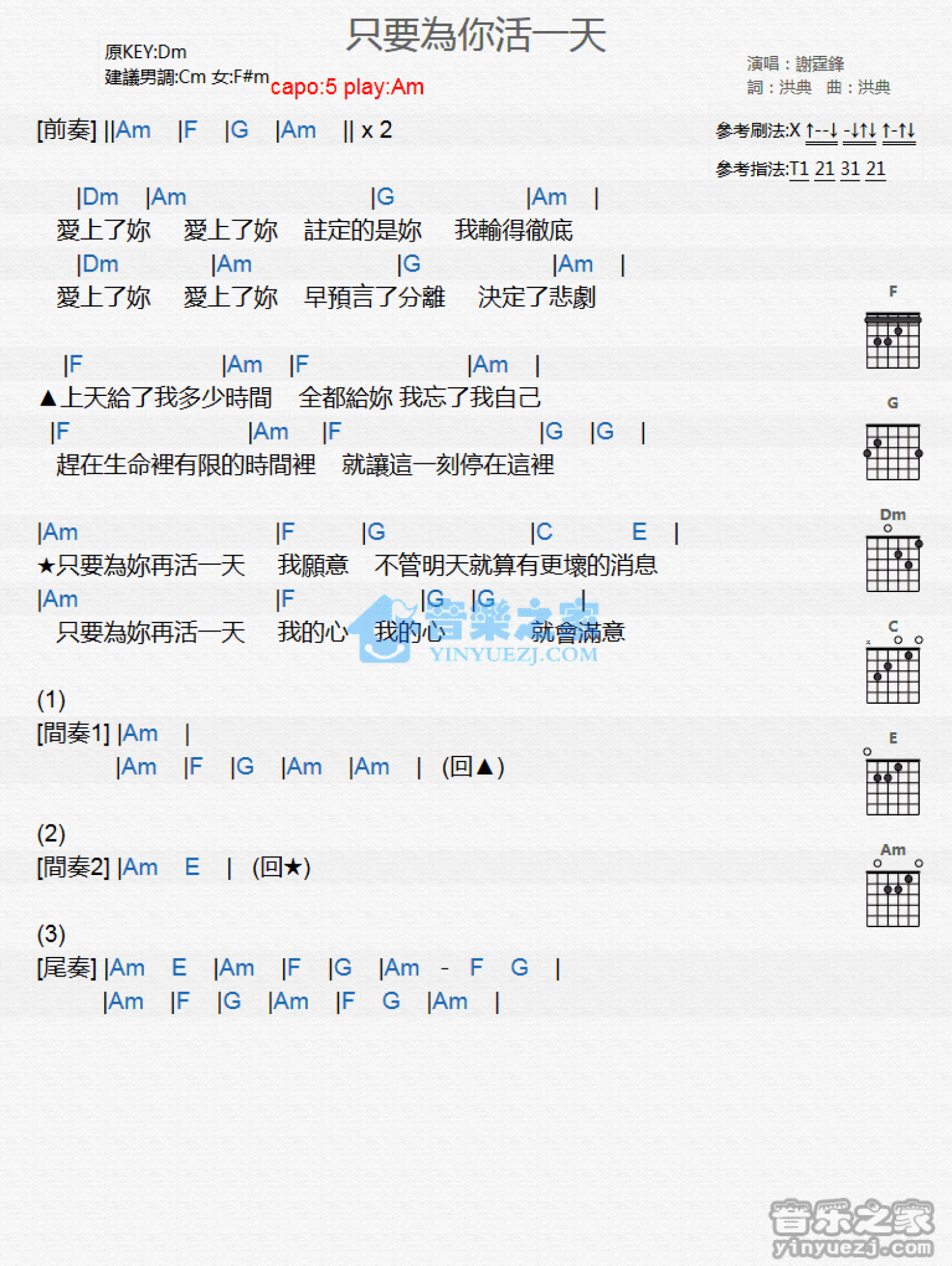 曲谱介绍: Am调版 谢霆锋《只要为你活一天》吉他和弦弹唱谱