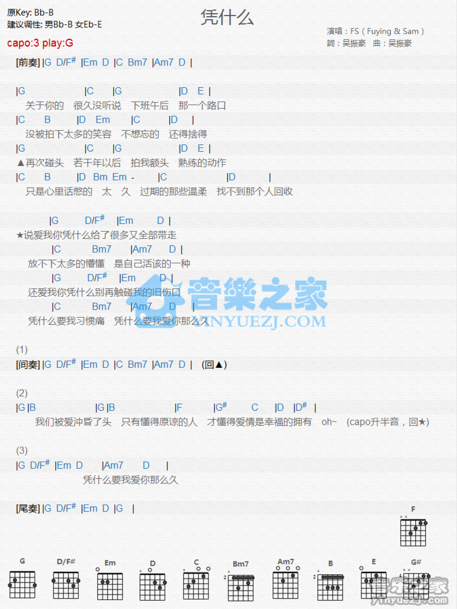 曲谱介绍: G调版 FS《凭什么》吉他和弦弹唱谱