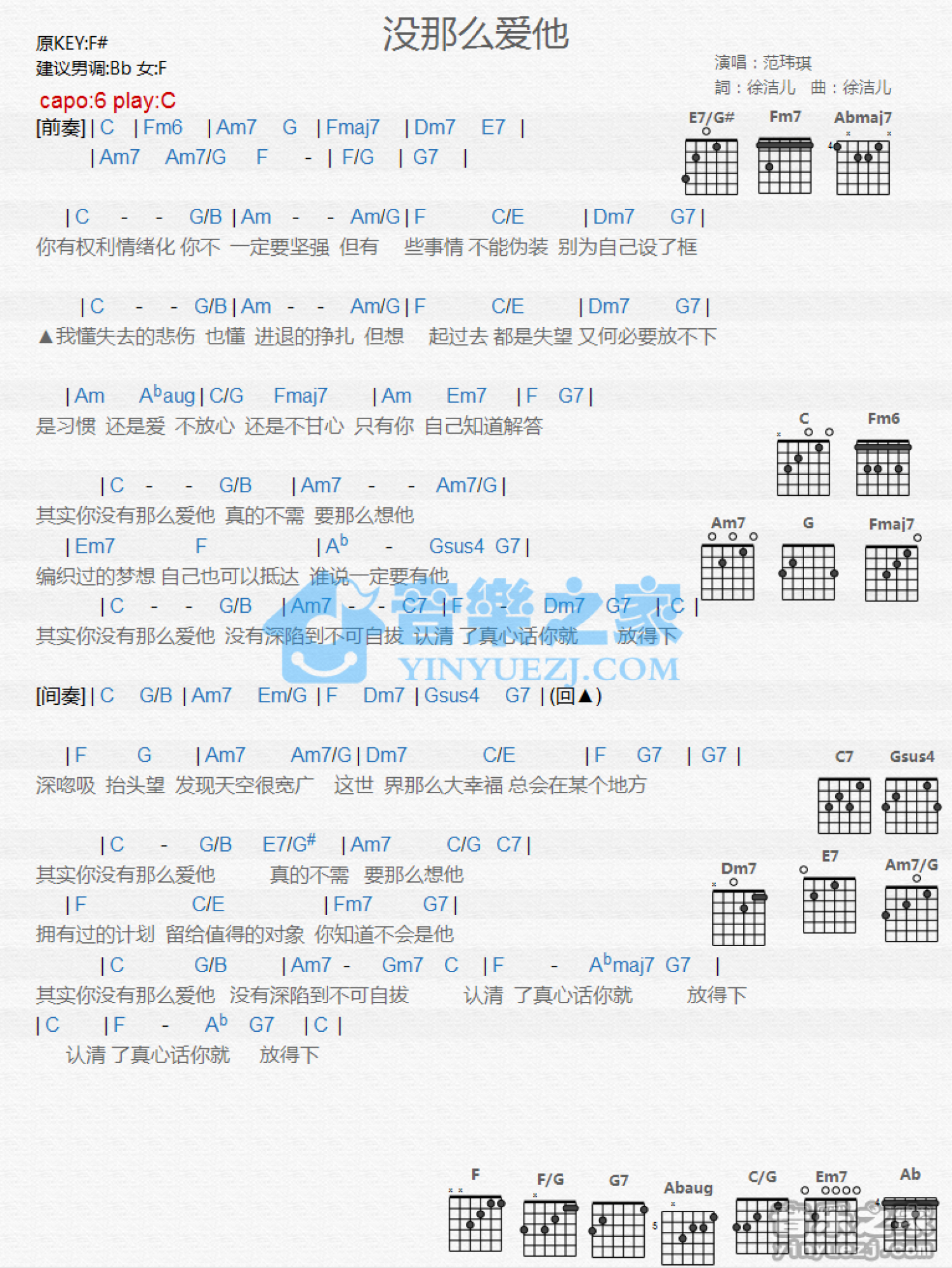 曲谱介绍: C调版 范玮琪《没那么爱他》吉他和弦弹唱谱