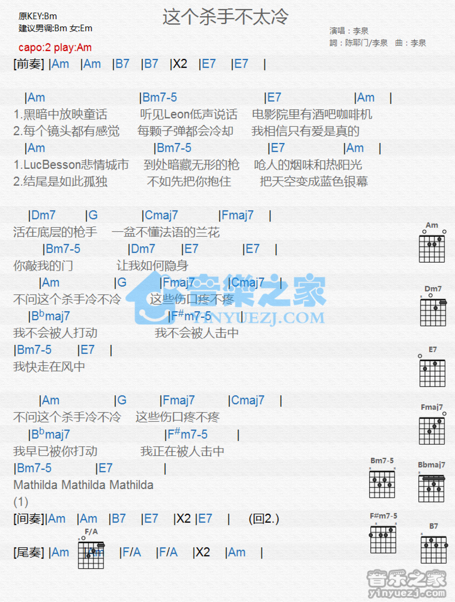 曲谱介绍: Am调版 李泉《这个杀手不太冷》吉他和弦弹唱谱