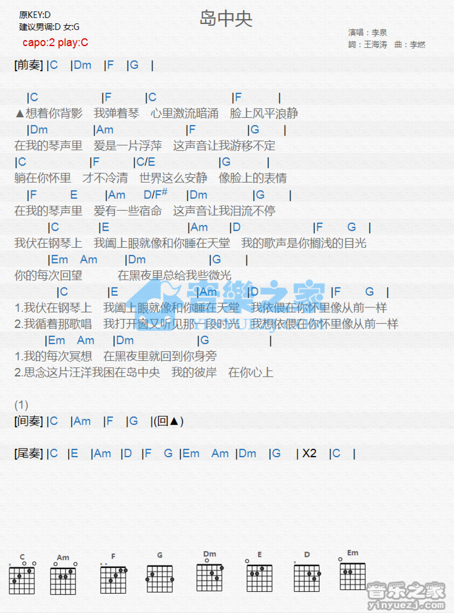 曲谱介绍: C调版 李泉《岛中央》吉他和弦弹唱谱