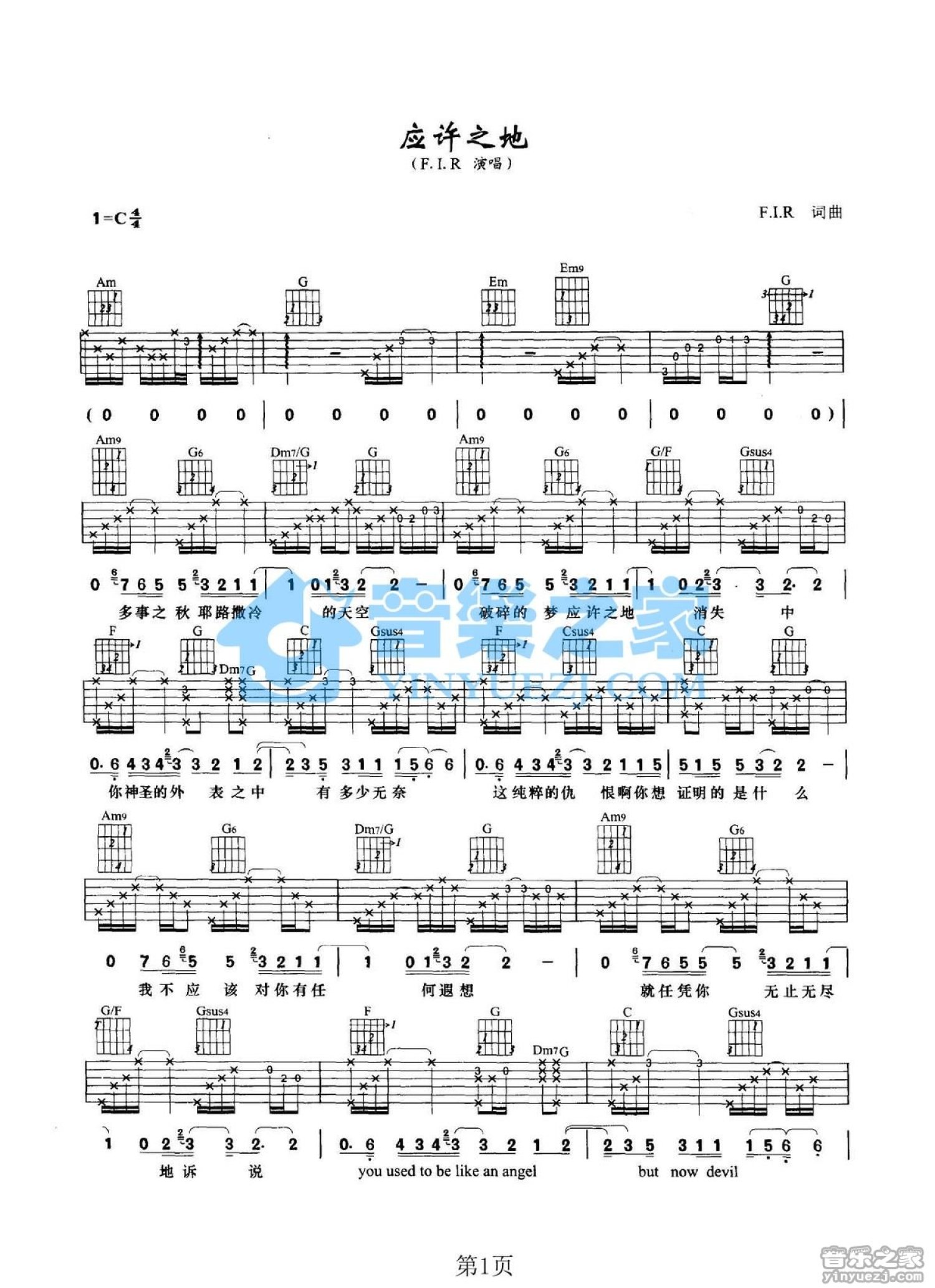 曲谱介绍: C调版 F.I.R《应许之地》吉他弹唱六线谱