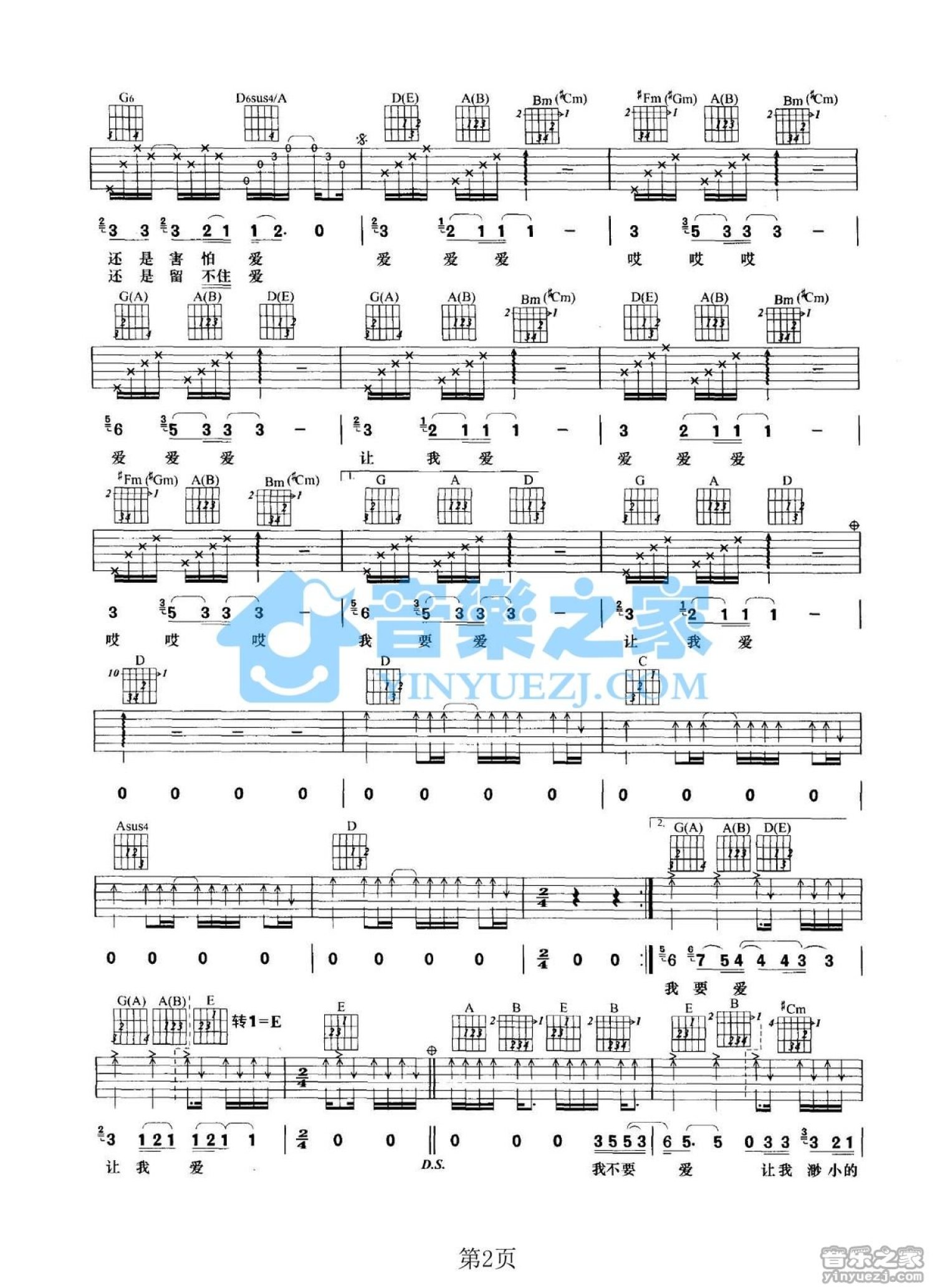 曲谱介绍: D转E调版 阿桑《让我爱》吉他弹唱六线谱