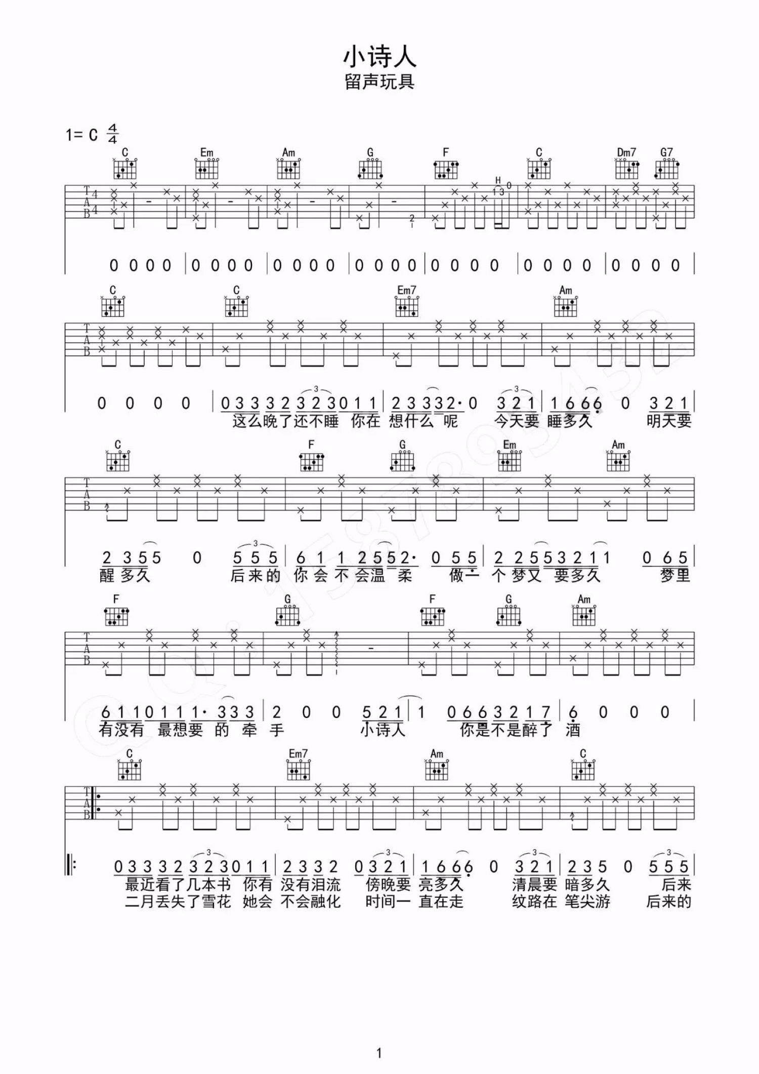 小诗人吉他谱 - 留声玩具 - C调吉他弹唱谱